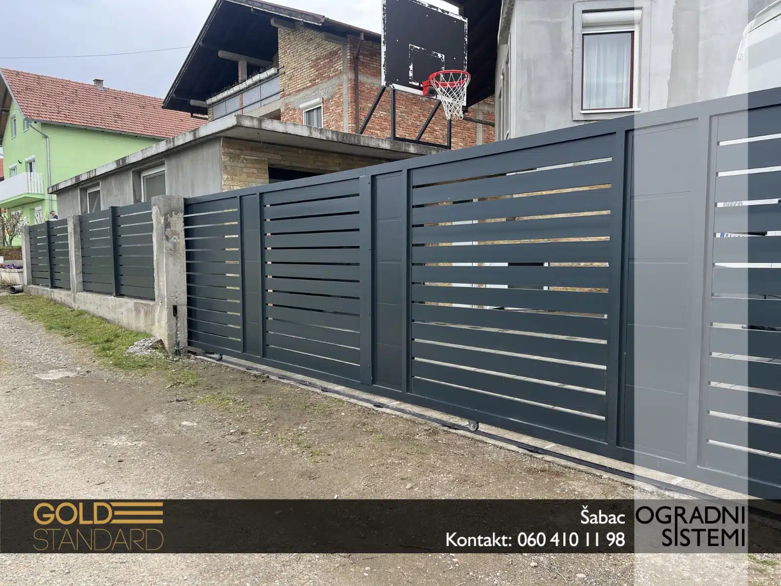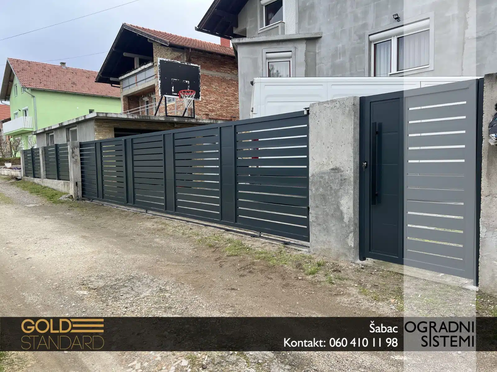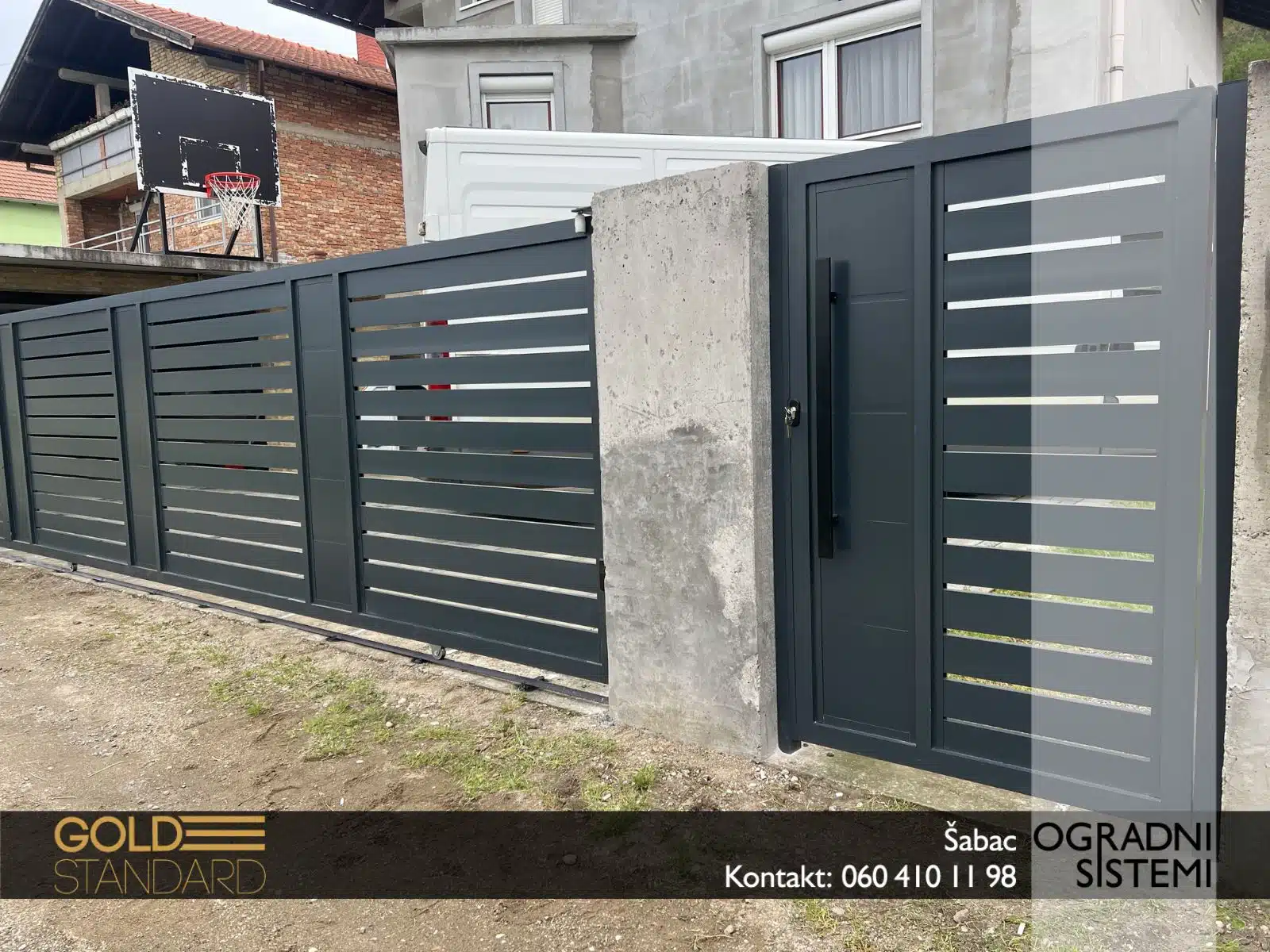 – Klizna aluminijumska kapija sa aluminijumskim panelima – čvrsta, tiha i dugotrajna