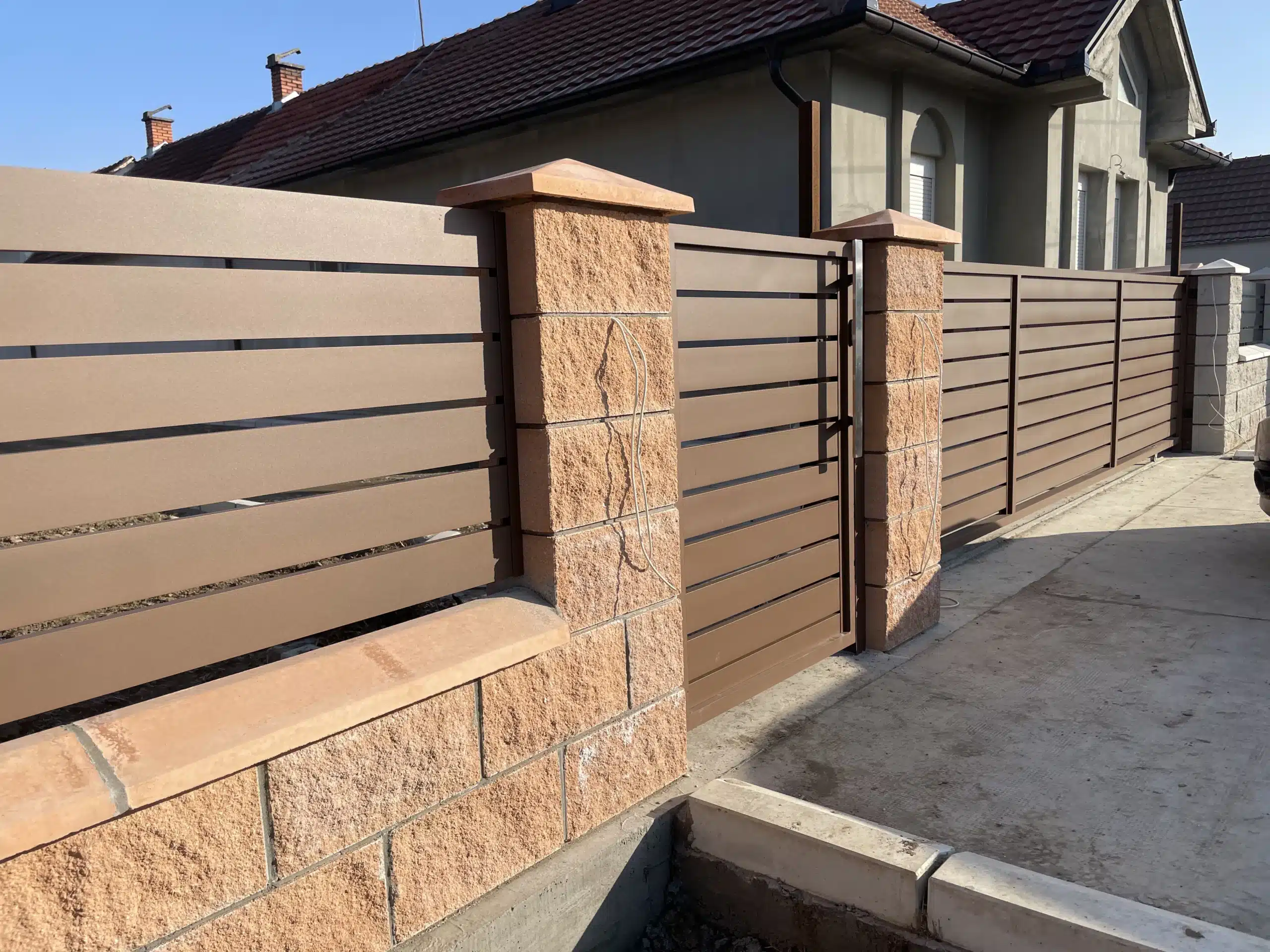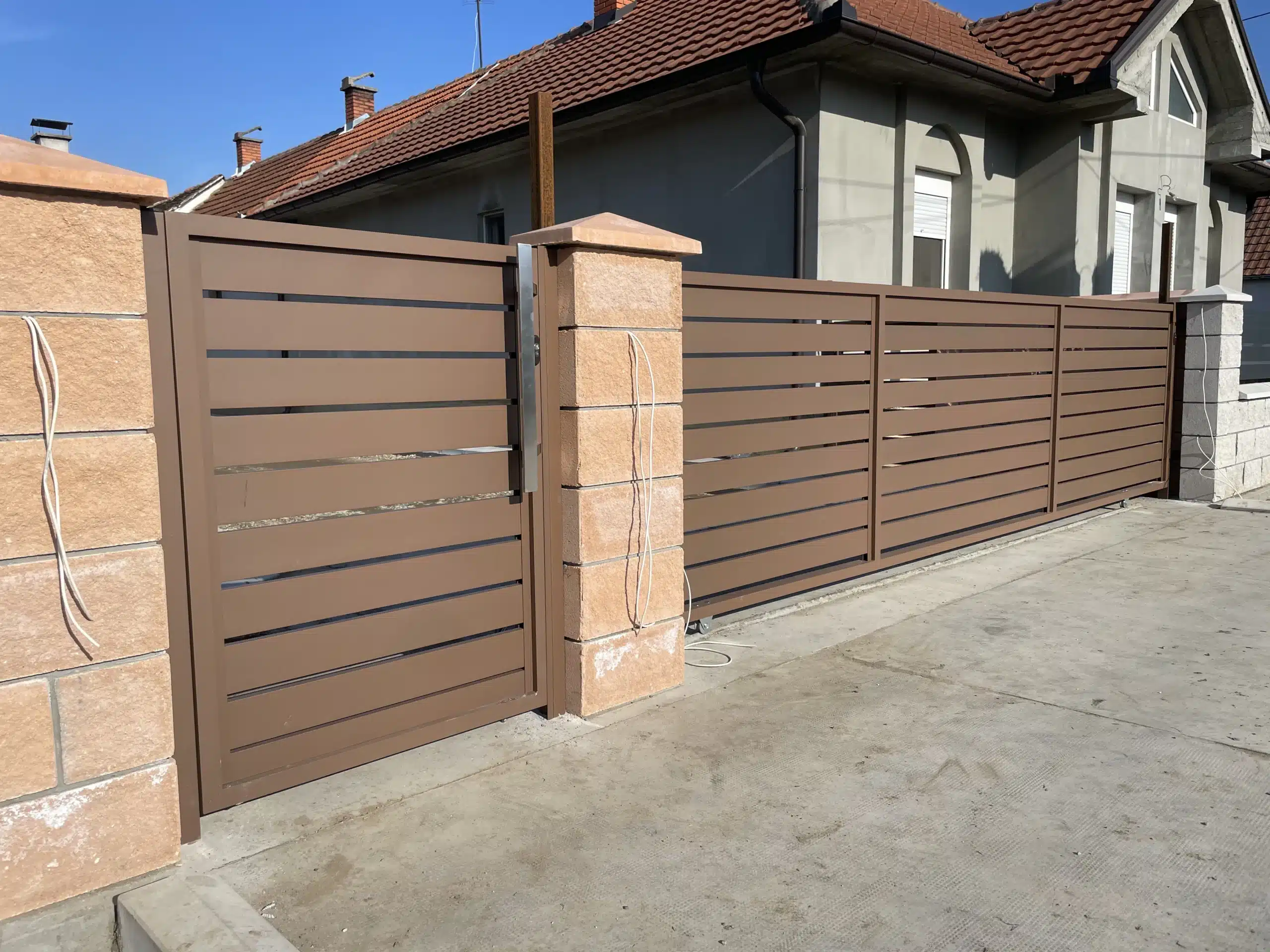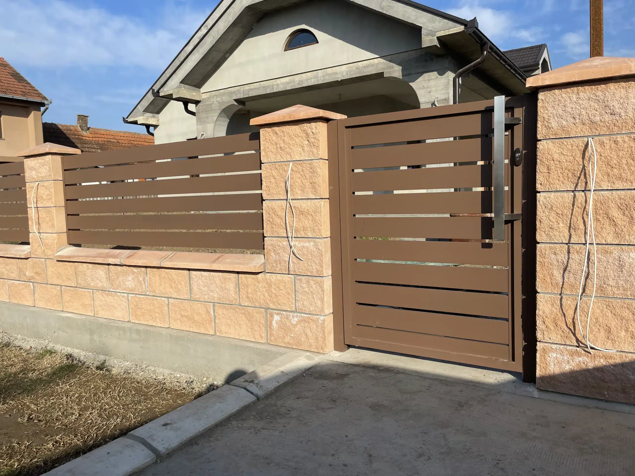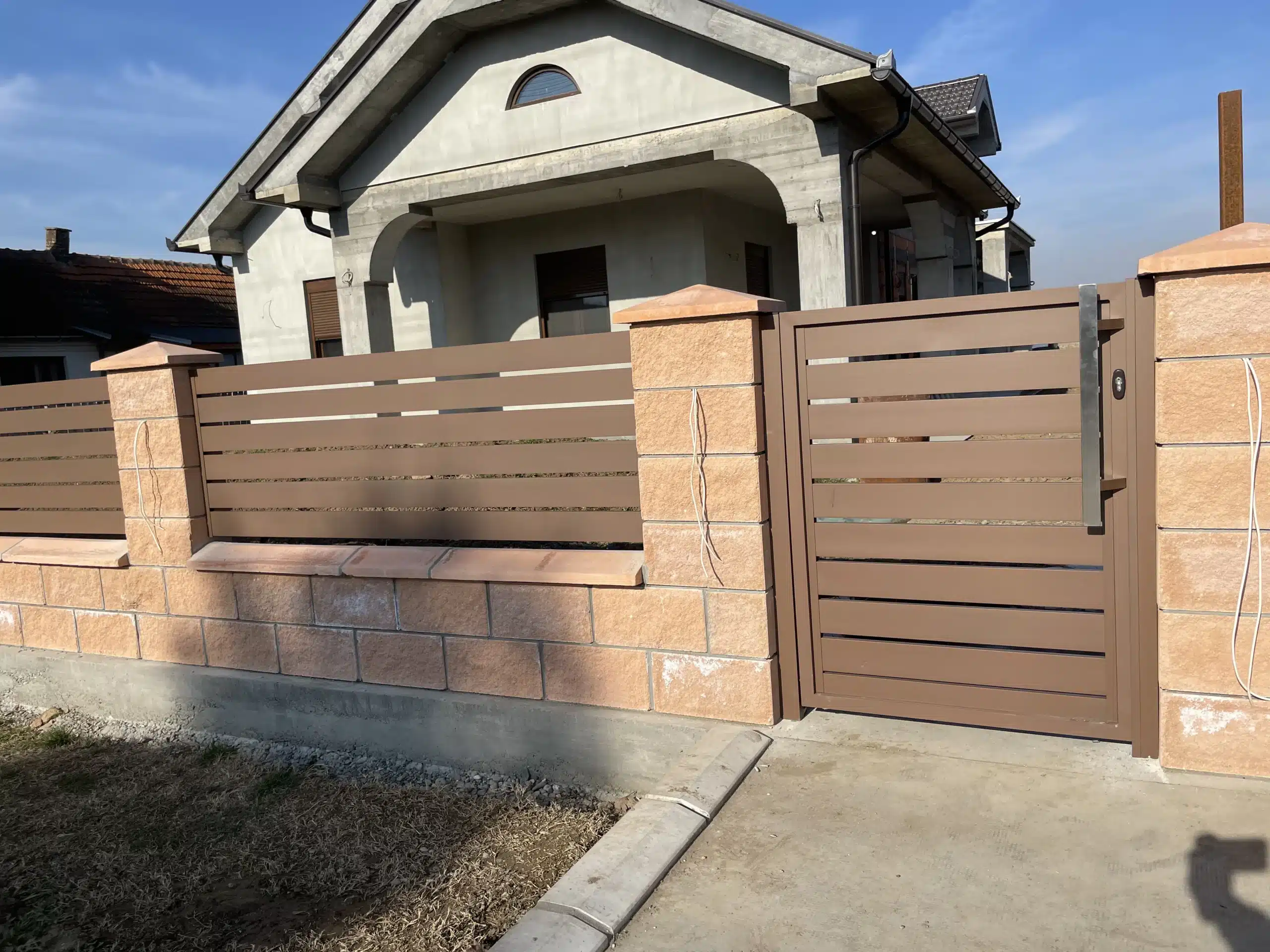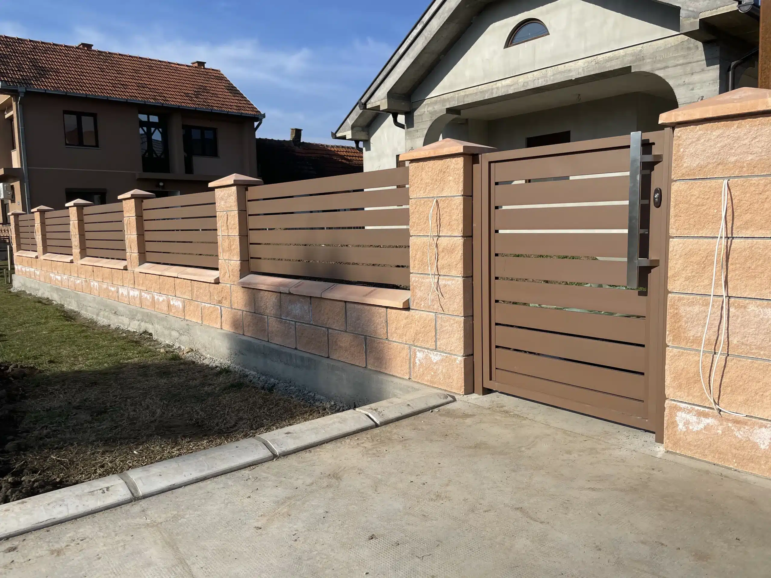 Svi elementi su plastificirani u braon boju, koja se besprekorno uklopila uz dekorativne blokove korišćene za zidanje ograde. Ova kombinacija daje topao i prirodan izgled, istovremeno obezbeđujući dugotrajnost i otpornost na spoljašnje uticaje.