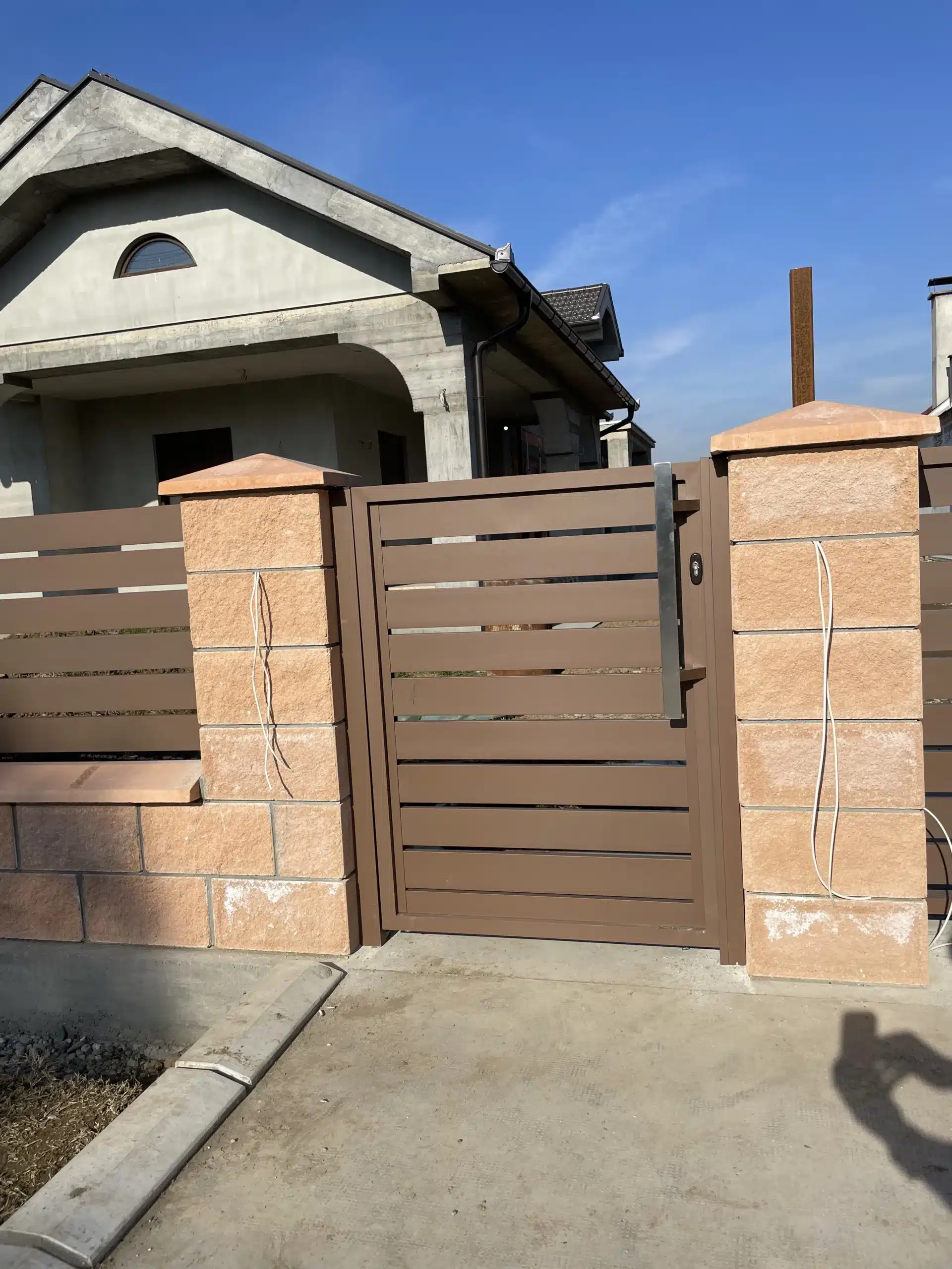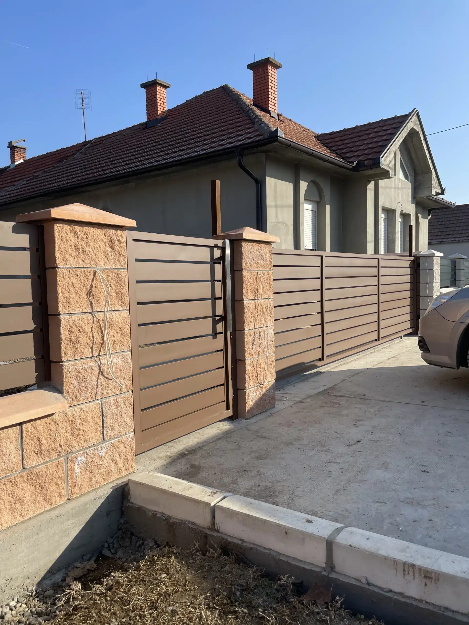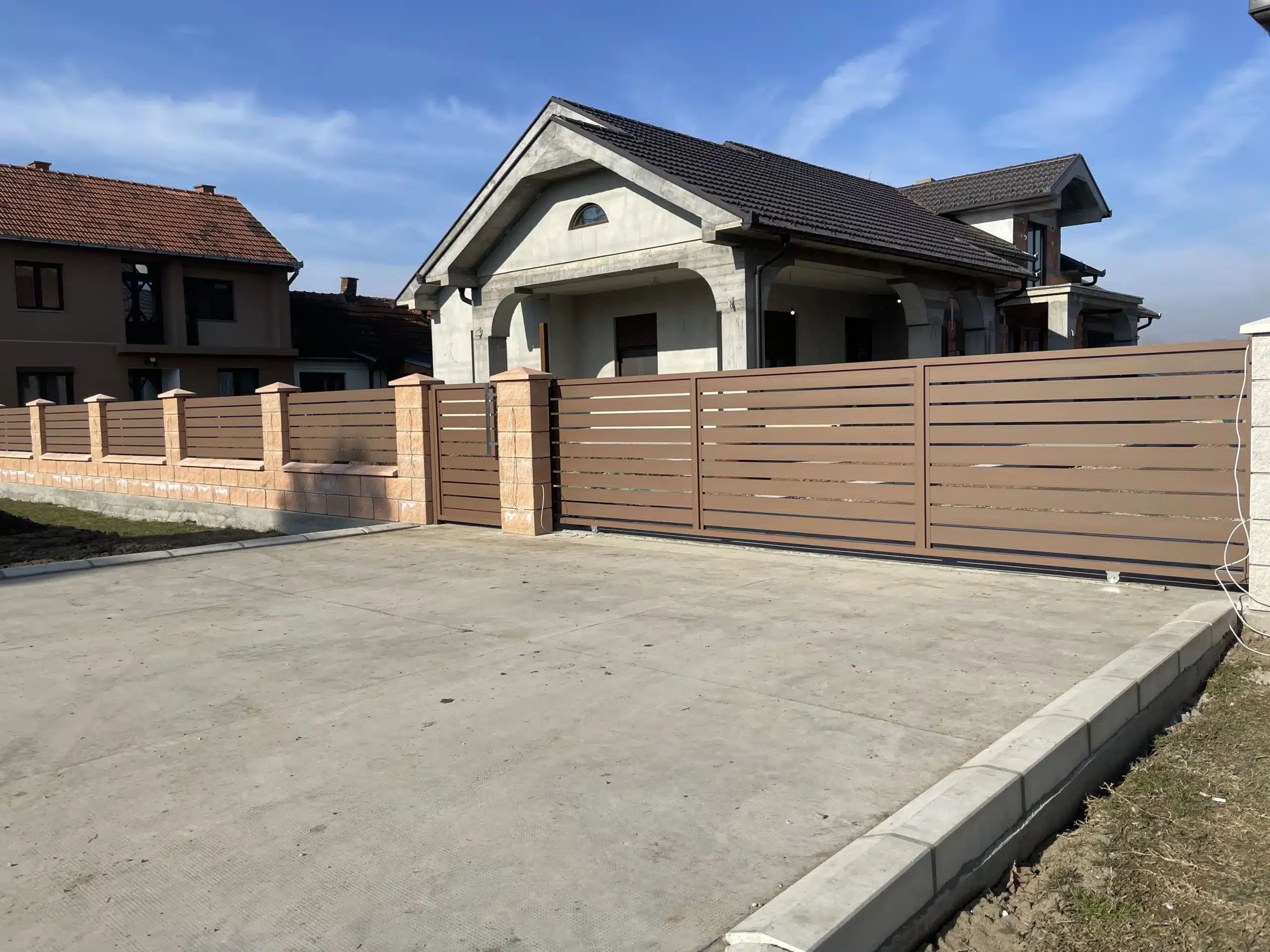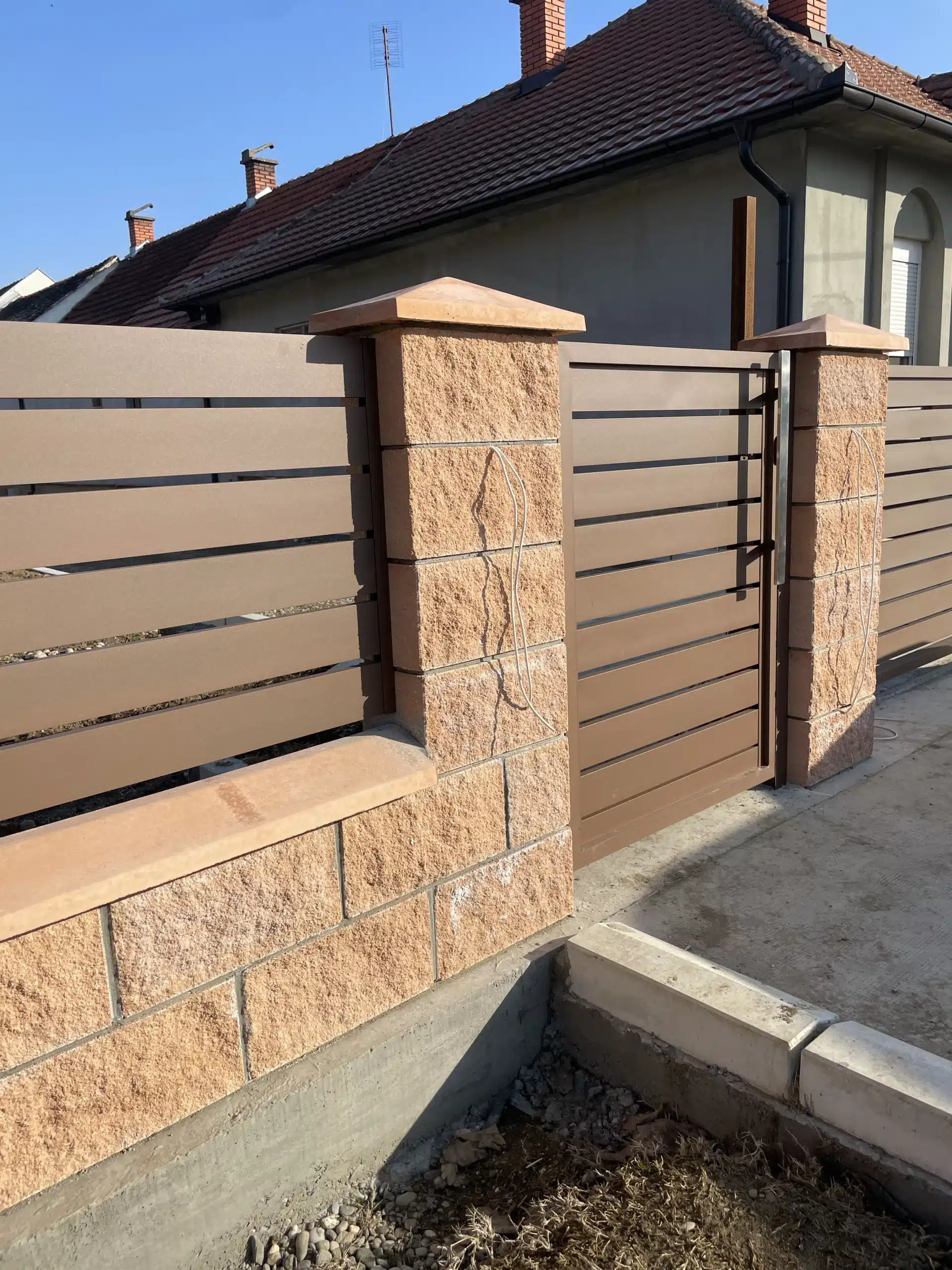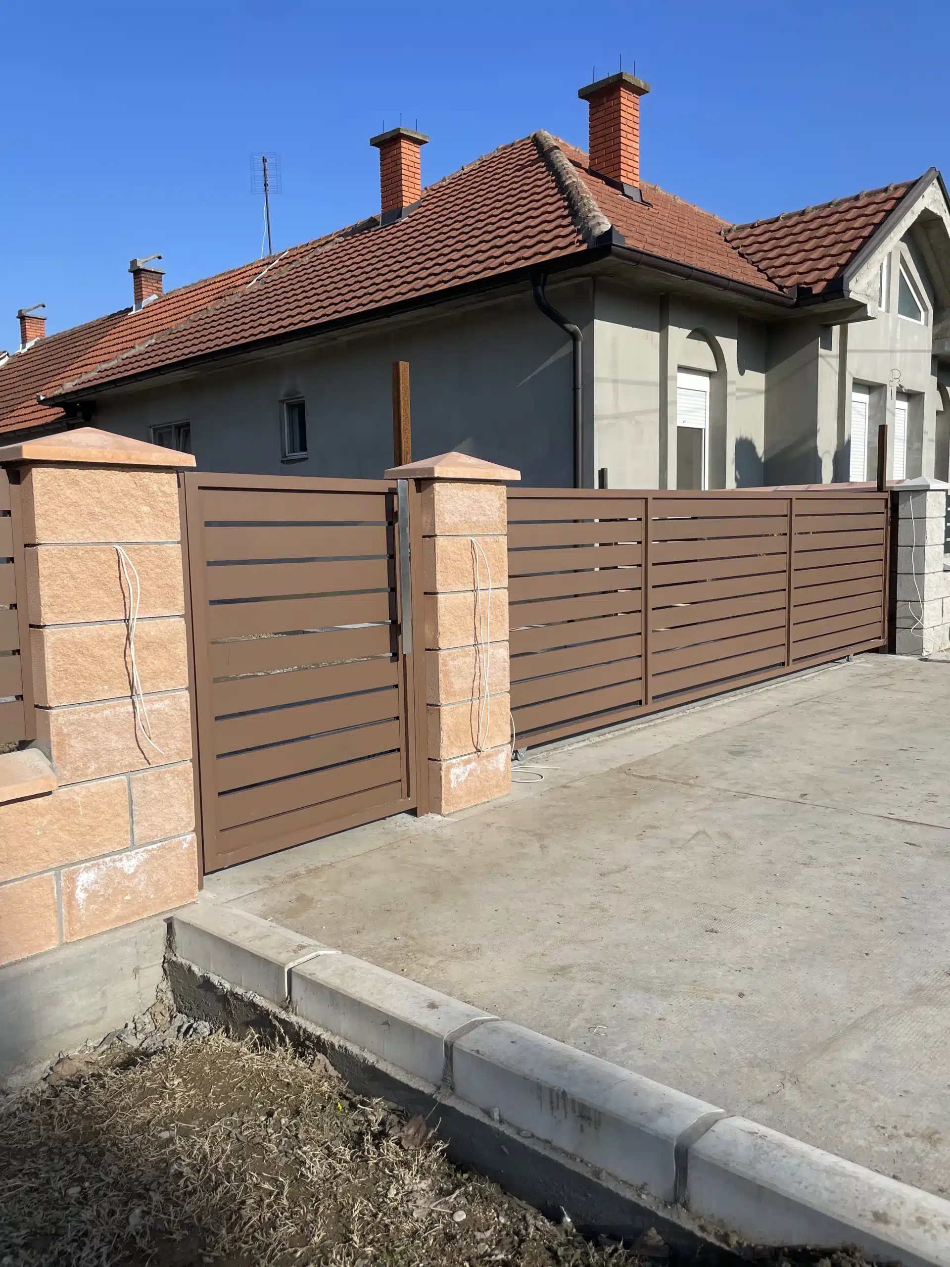 Svi elementi su plastificirani u braon boju, koja se besprekorno uklopila uz dekorativne blokove korišćene za zidanje ograde. Ova kombinacija daje topao i prirodan izgled, istovremeno obezbeđujući dugotrajnost i otpornost na spoljašnje uticaje.
