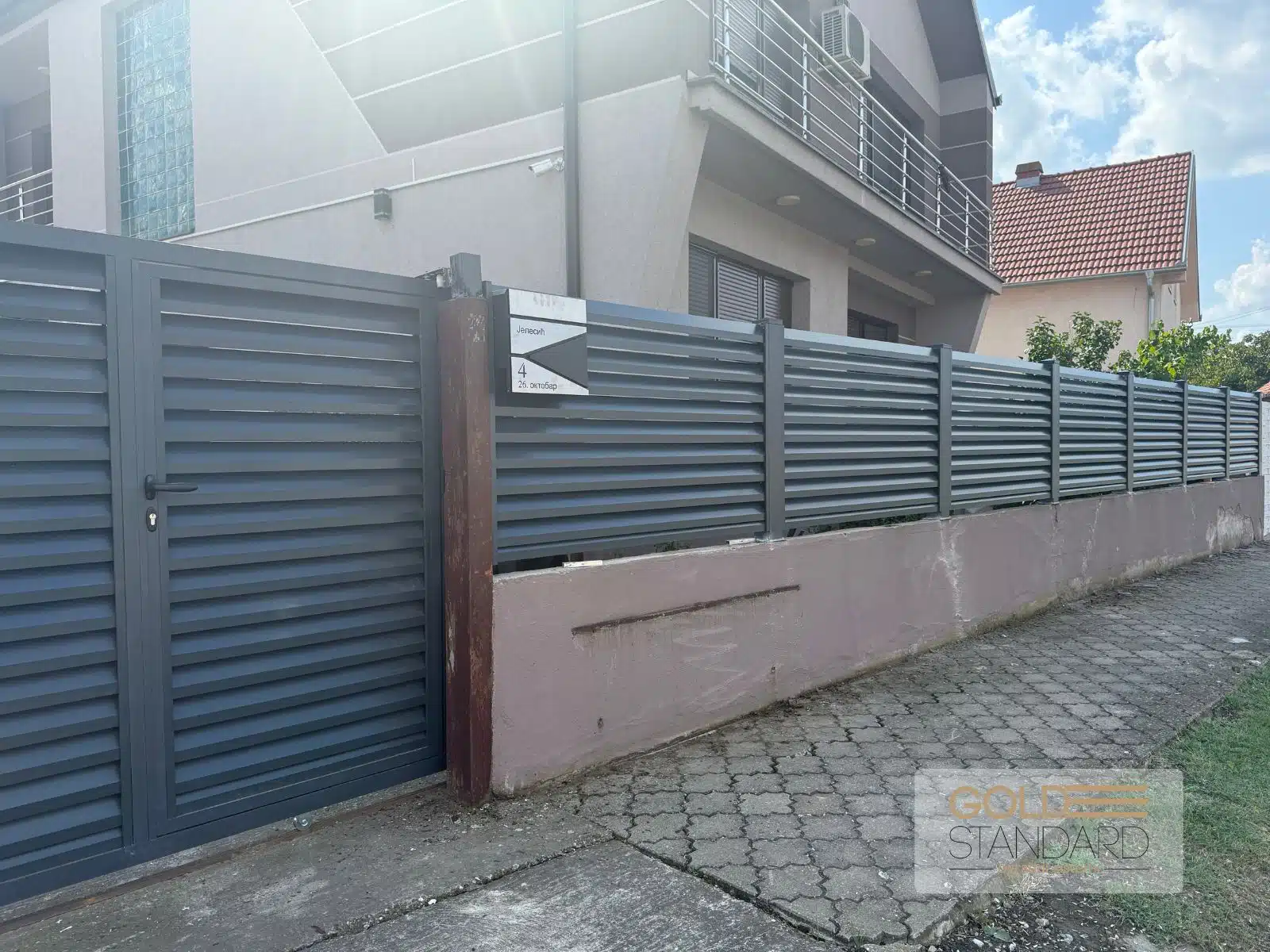 Kapija i ograda oslonjeni su na aluminijumske stubove dimenzija 100×100, što obezbeđuje dodatnu stabilnost i dugotrajnost cele konstrukcije.