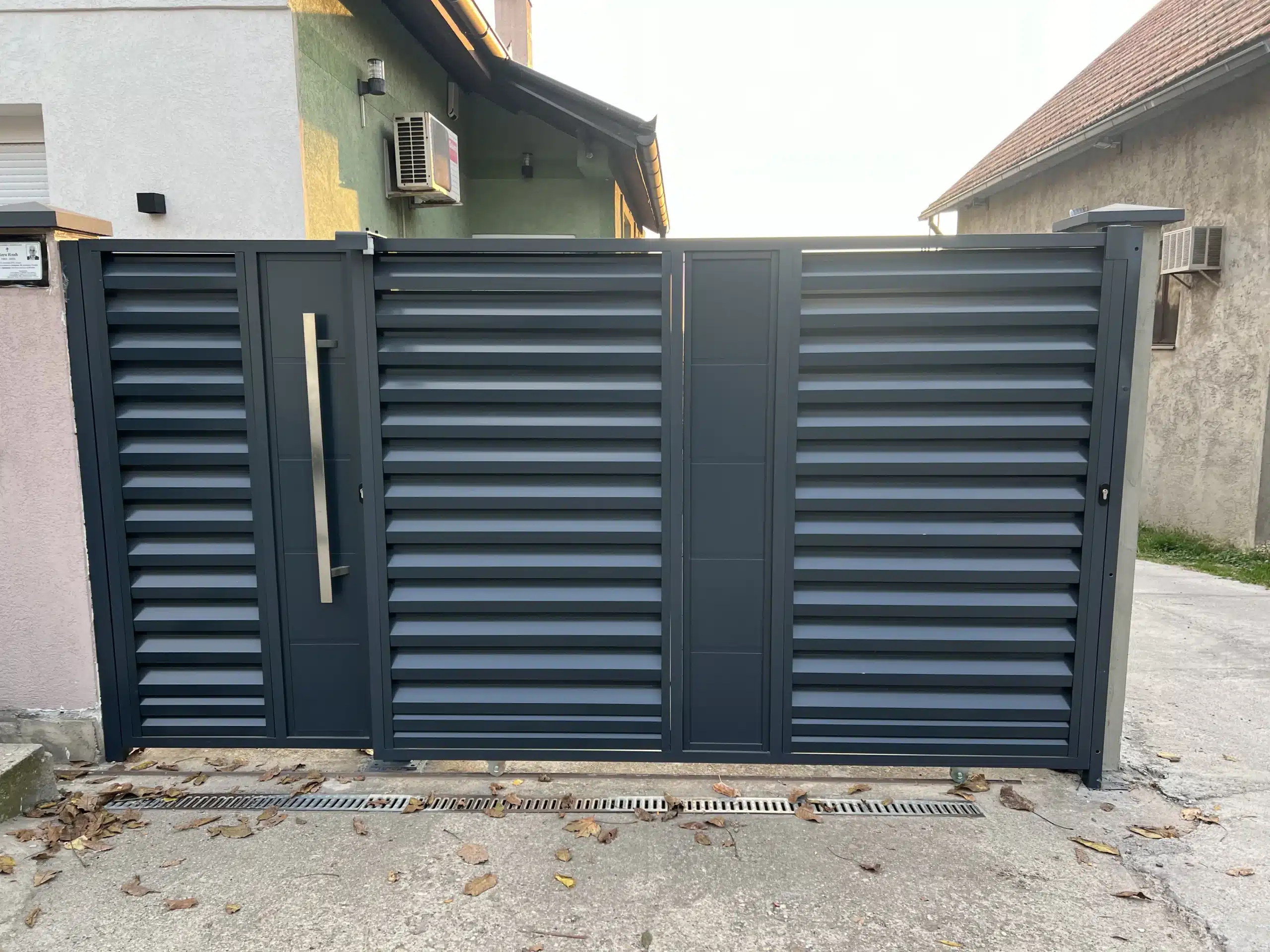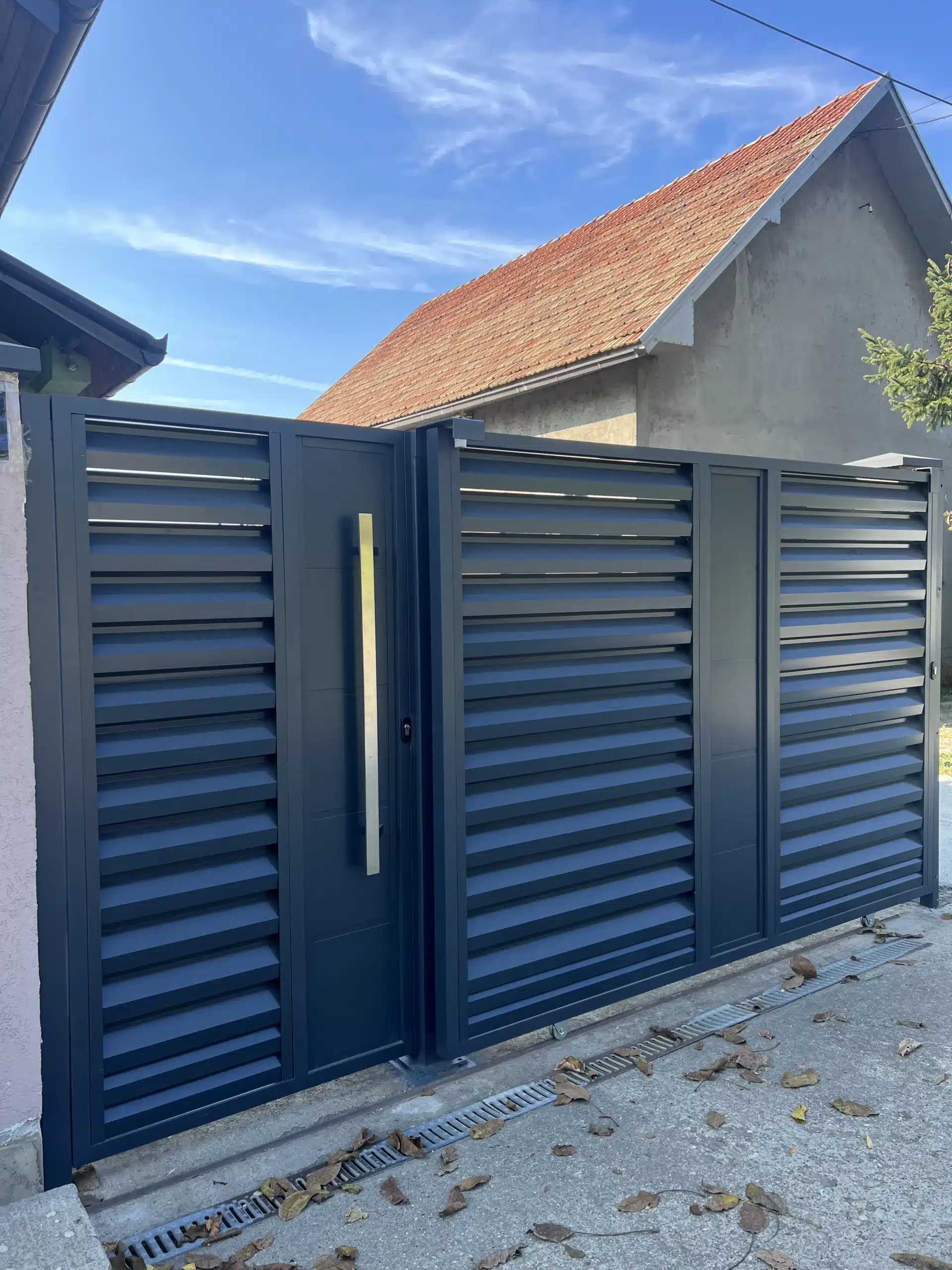 Klizna aluminijumska kapija + alu kapija za pešački ulaz + samonosiva alu kapija na daljinsko otvaranje + alu ograda – montaža u Jajincima