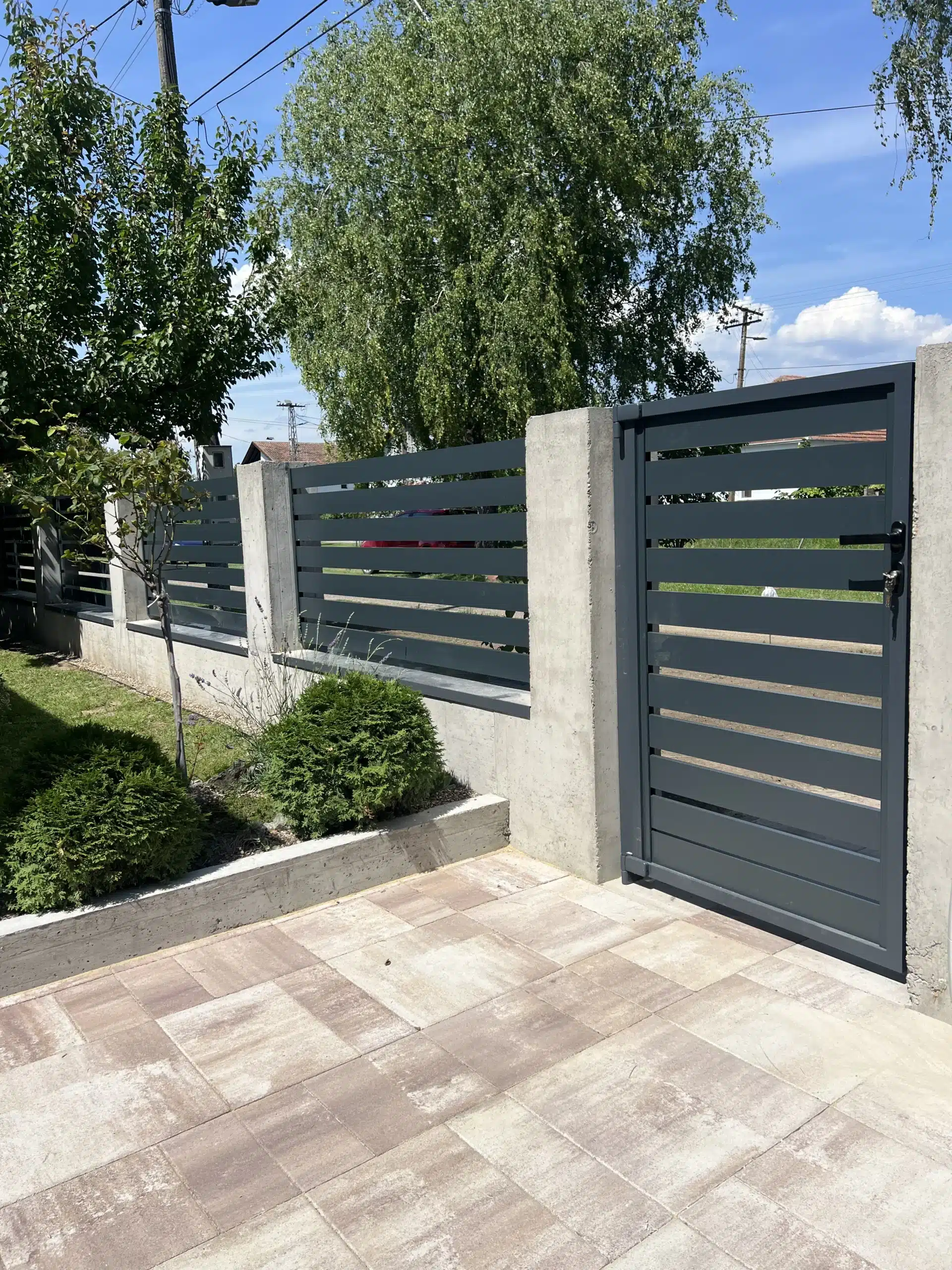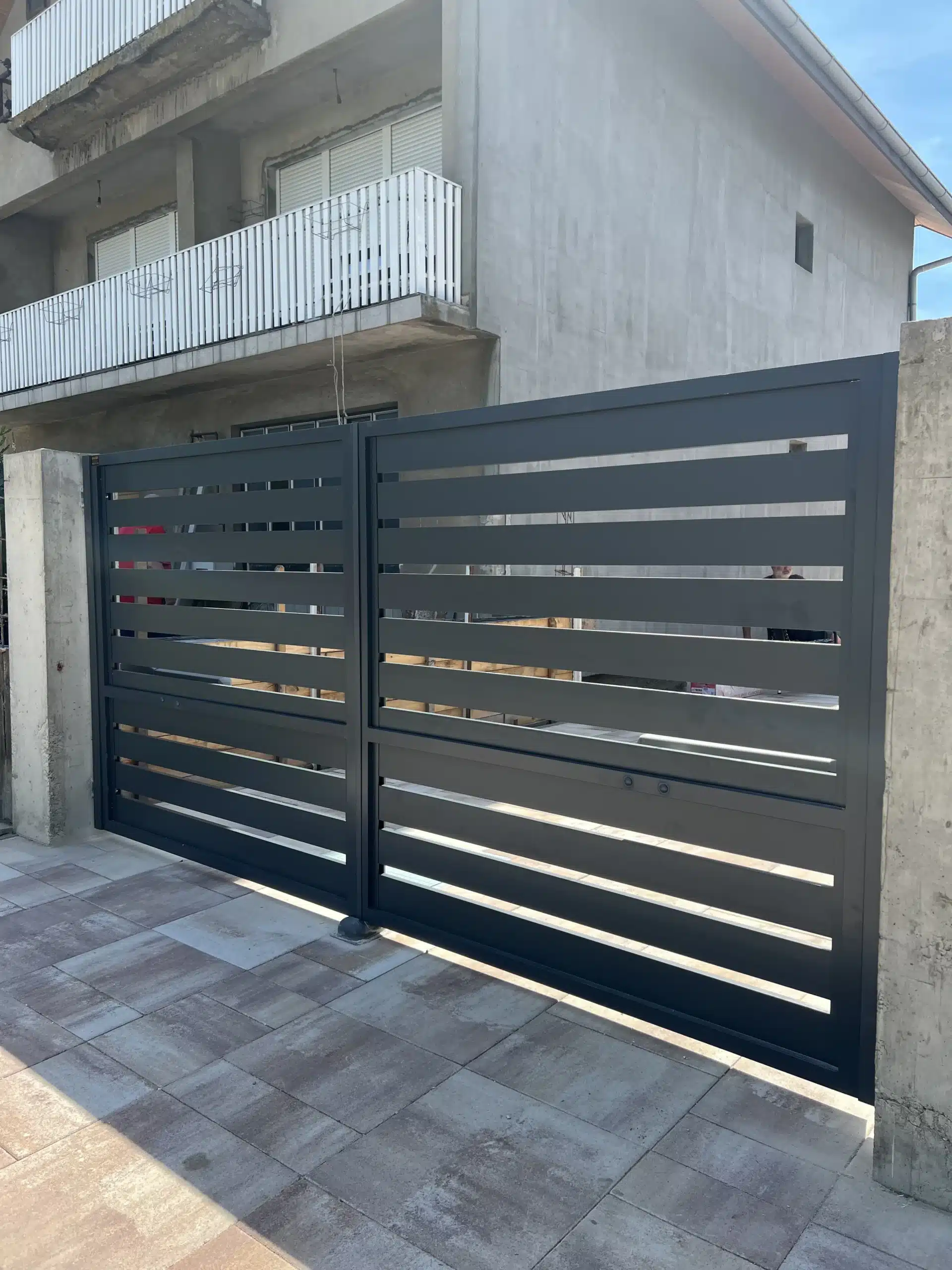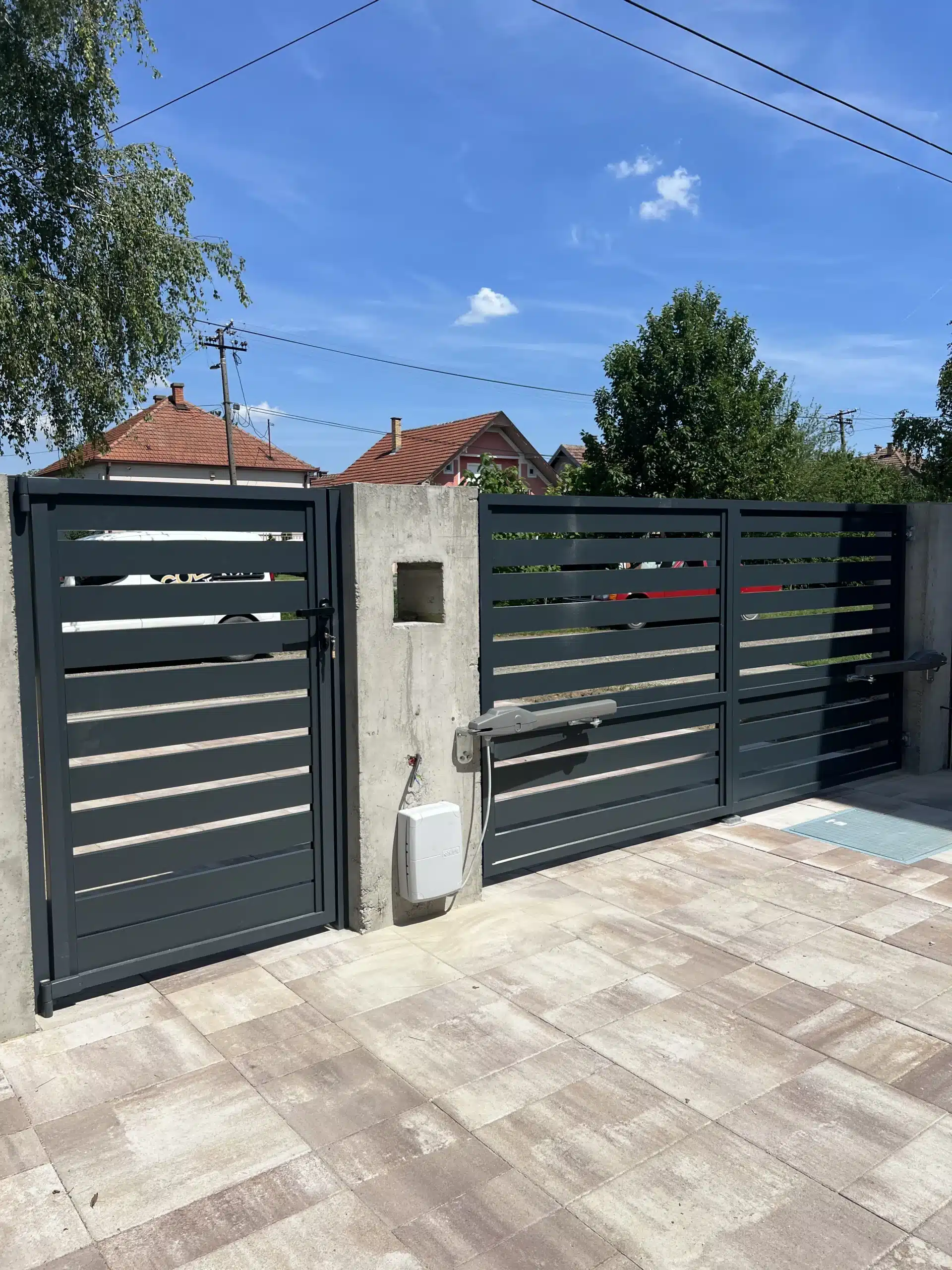 🔹️ Ugrađena je dvokrilna aluminijumska kapija sa automatskim (daljinskim) otvaranjem, aluminijumska ograda kao i mala kapija za pešački ulaz u dvorište. Za kompletan posao (klizna kapija, kapija za pešački ulaz, ograda) je korišnjen Amalfi model (ravni profil).