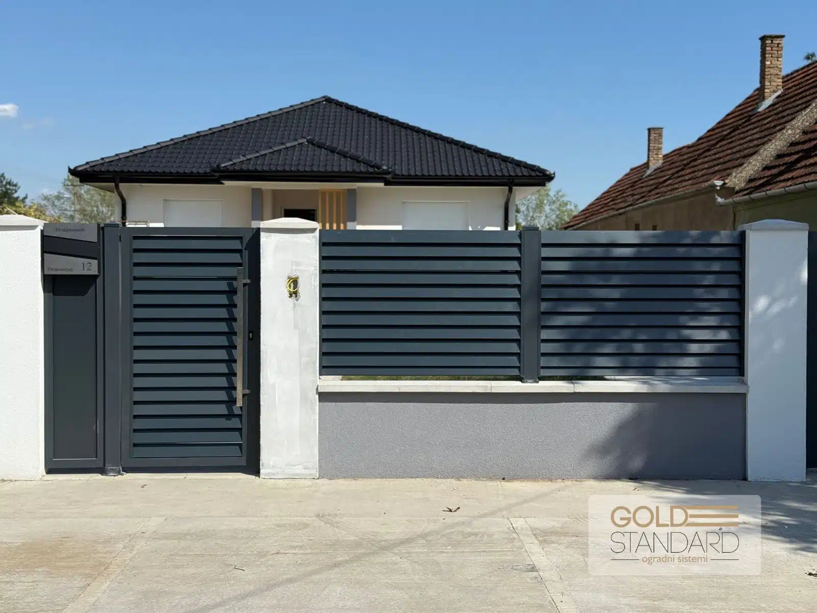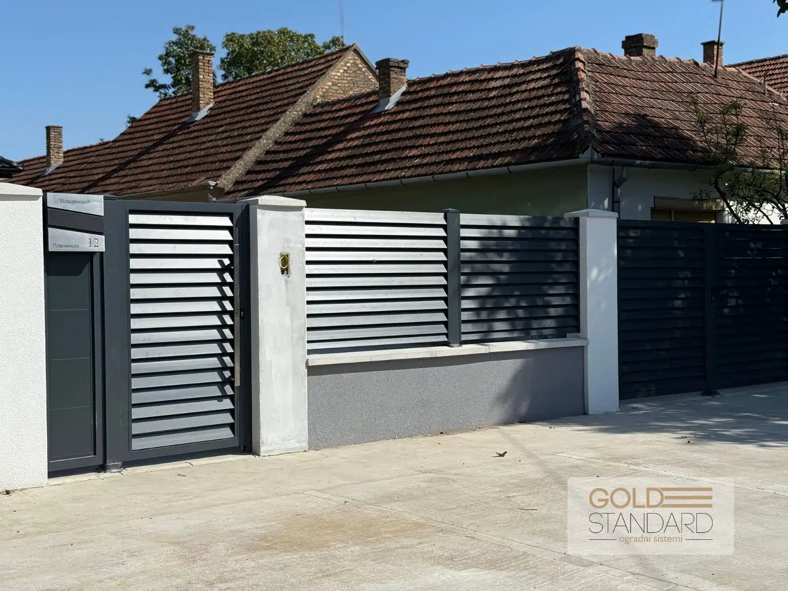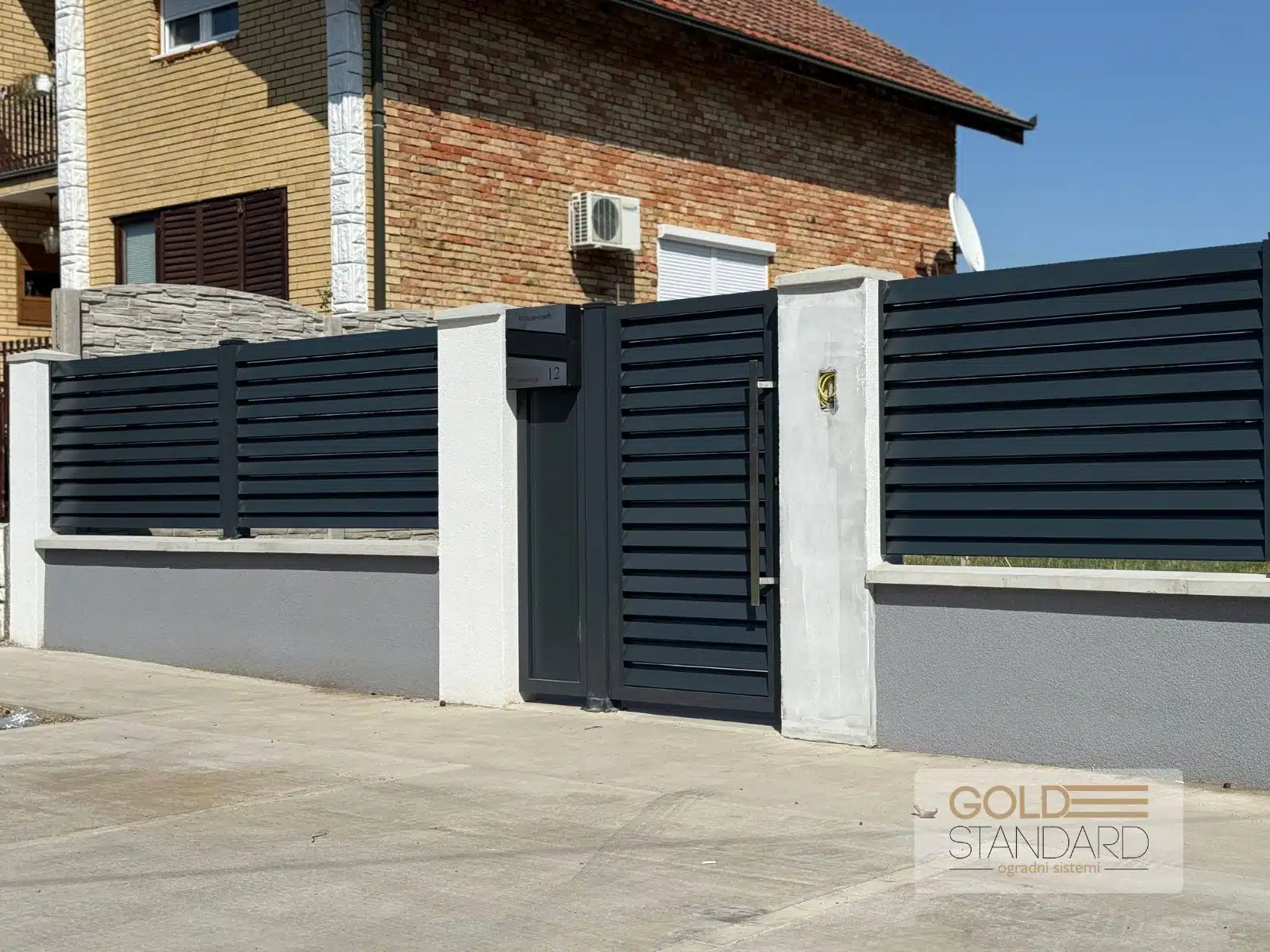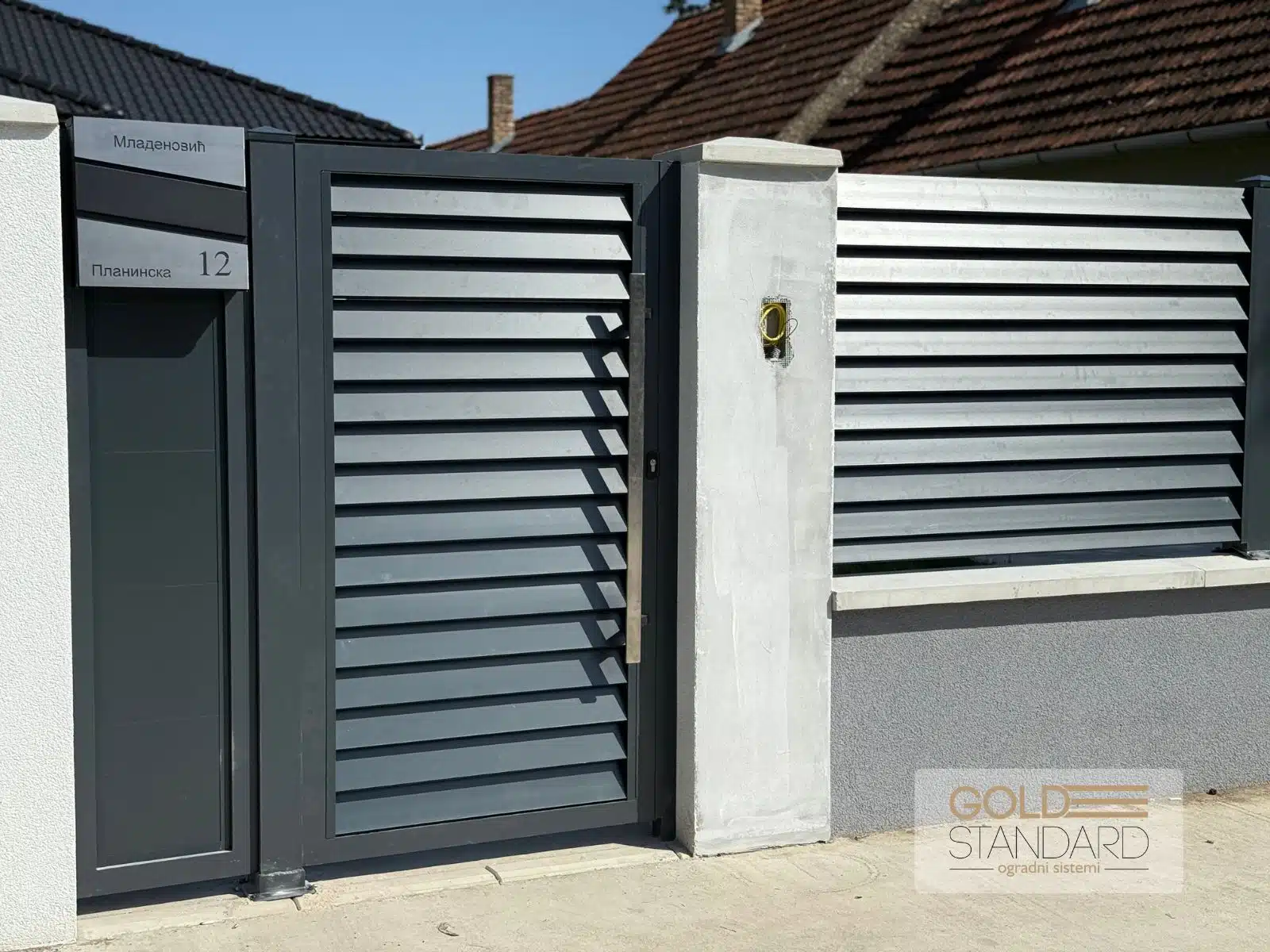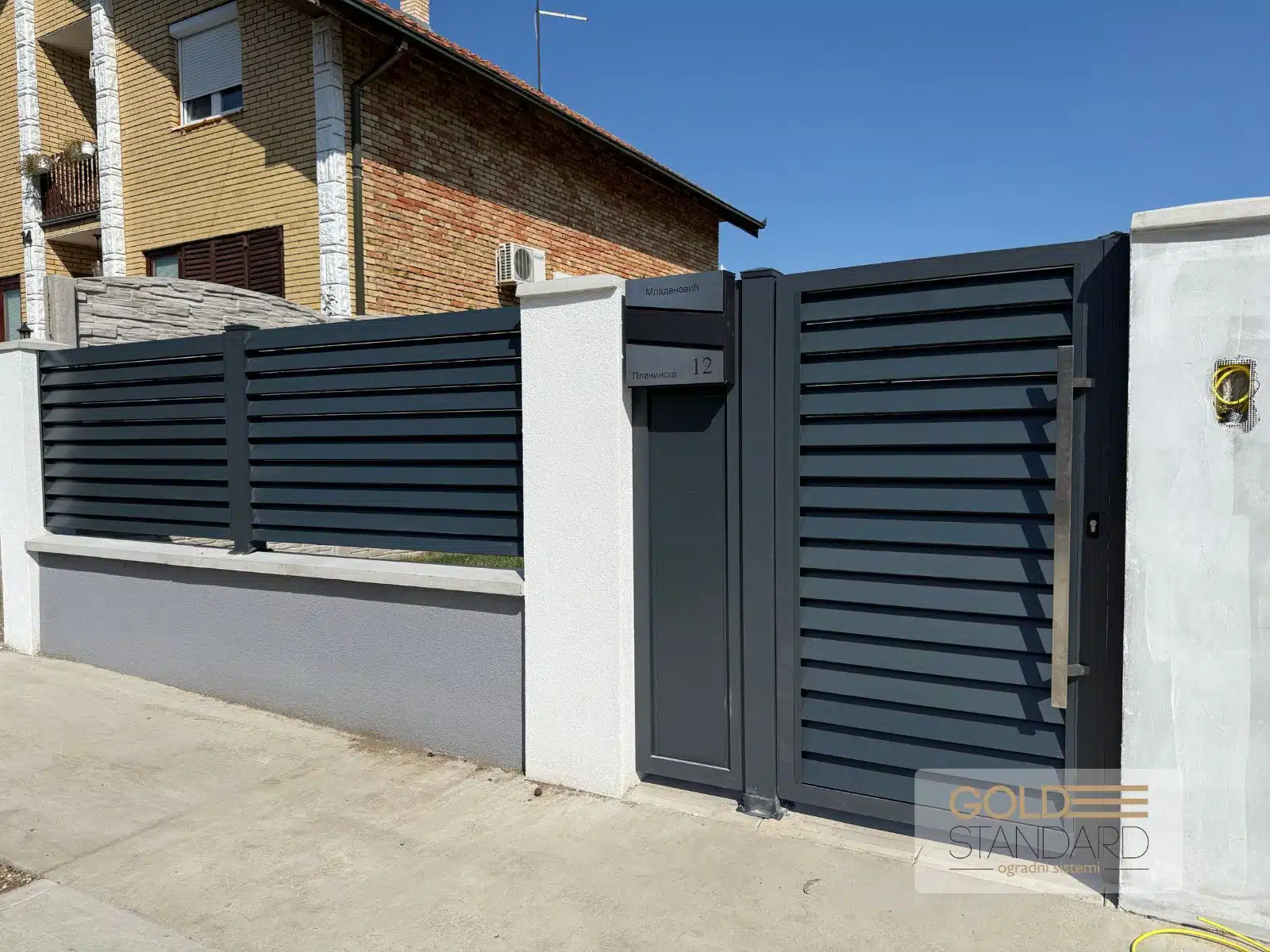 U sklopu projekta ugradili smo i poštansko sanduče sa gravurom, koje upotpunjuje celokupan vizuelni dojam i daje lični pečat. Inox rukohvat i elektronska brava obezbeđuju svakodnevnu udobnost i sigurnost, dok masivni aluminijumski stubovi 100×100 pružaju stabilnost i dug vek trajanja.