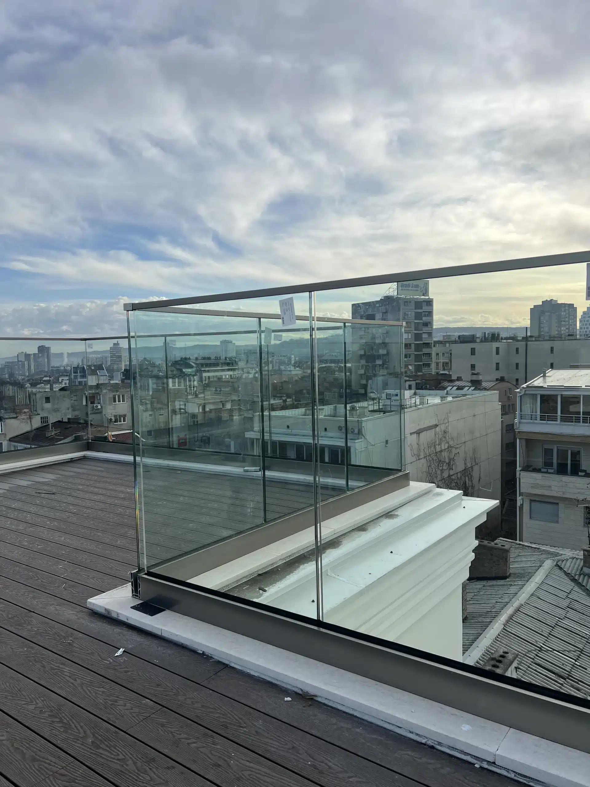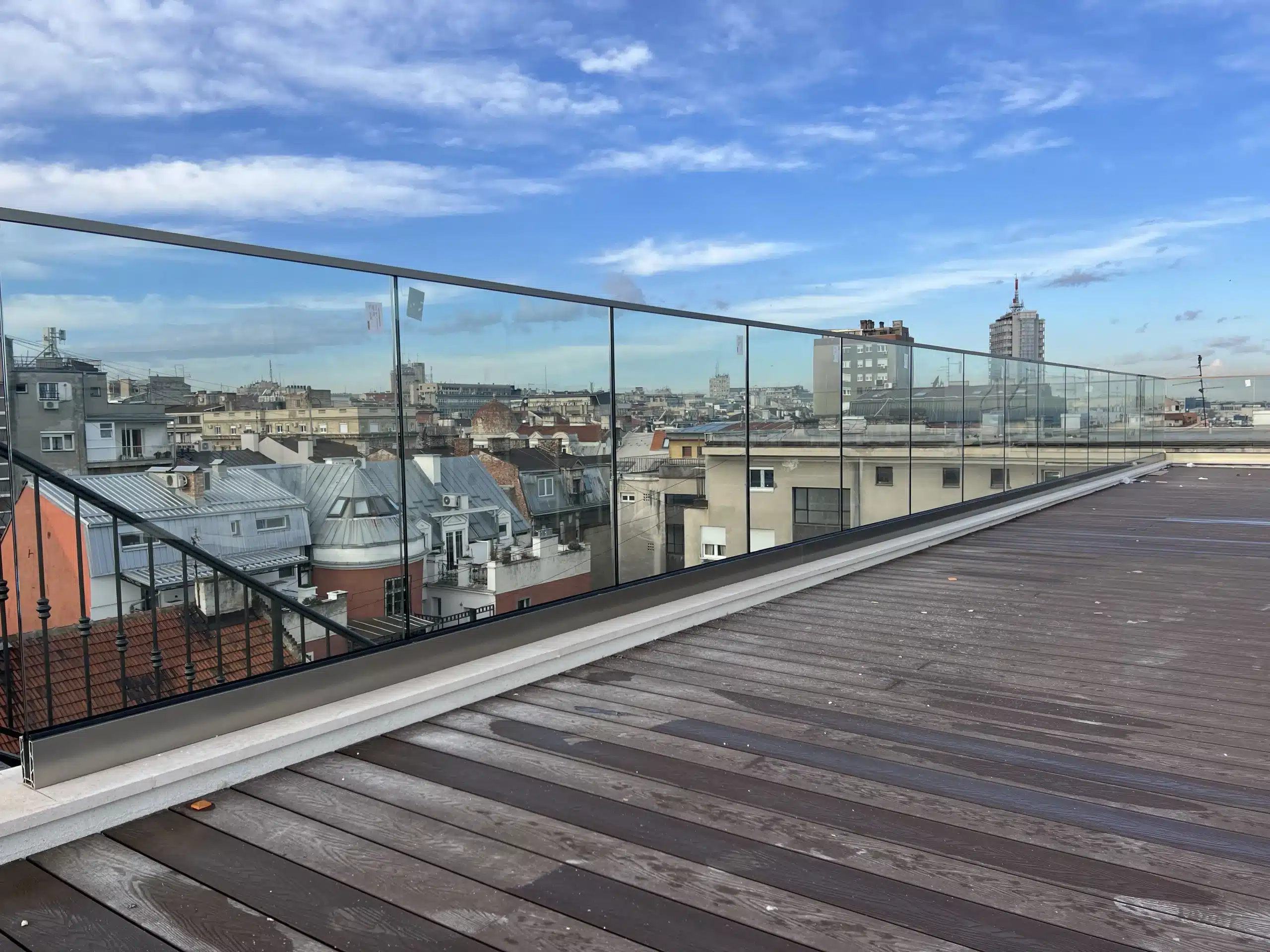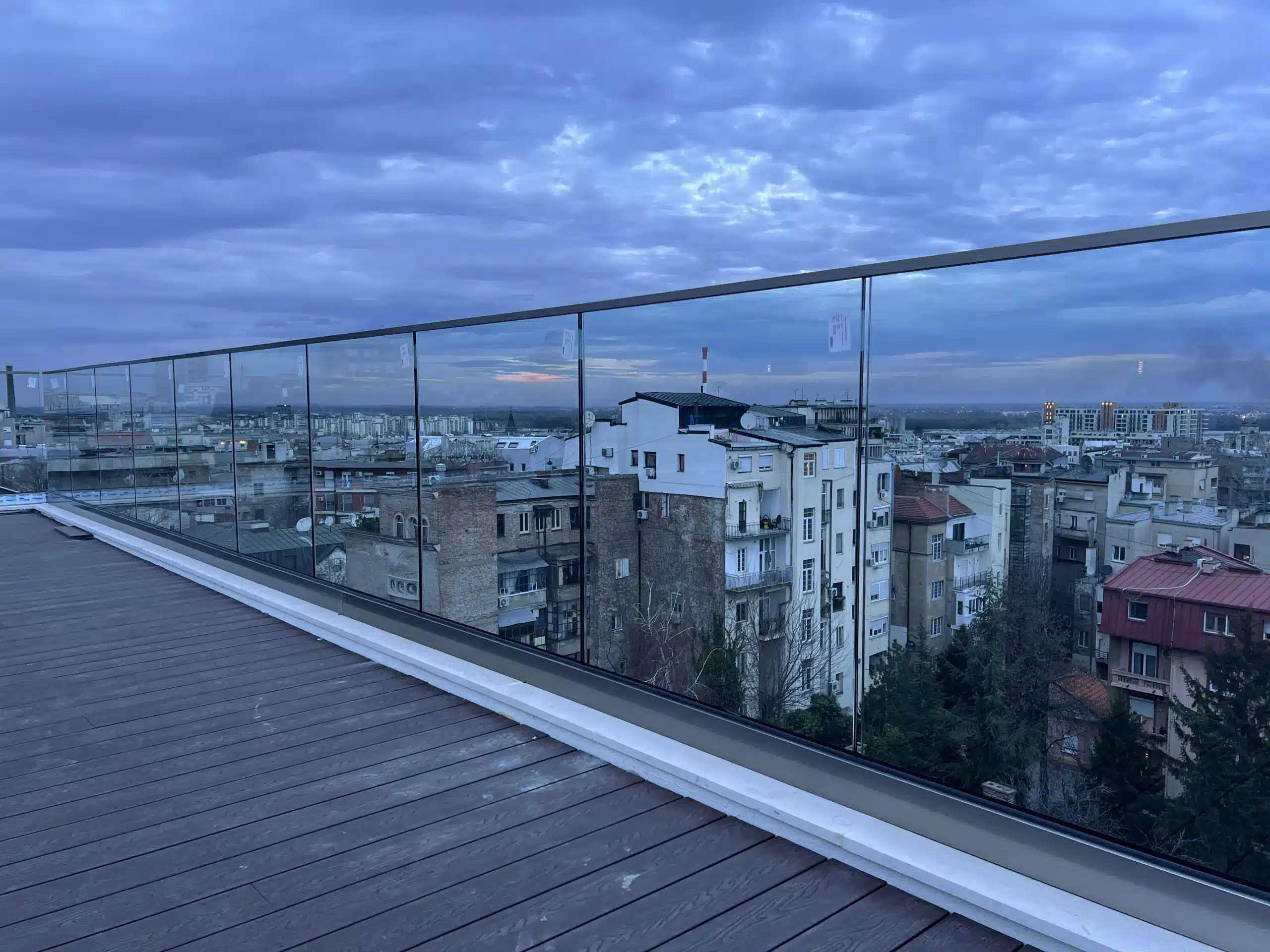 🔶️ Opis posla: 🔹️ Izrada i montaža staklene ograde na krovu stambene zgrade na Vračaru. Ugrađeno je kaljeno i laminirano staklo sa blagim stepenom zatamnjenja. 🔹️ Ugrađen je podni nosač od aluminijuma. Prednosti aluminijumskih nosača su: estetika, otpornost na koroziju, lakoća, čvrstoća, lako održavanje i dug vek trajanja.
