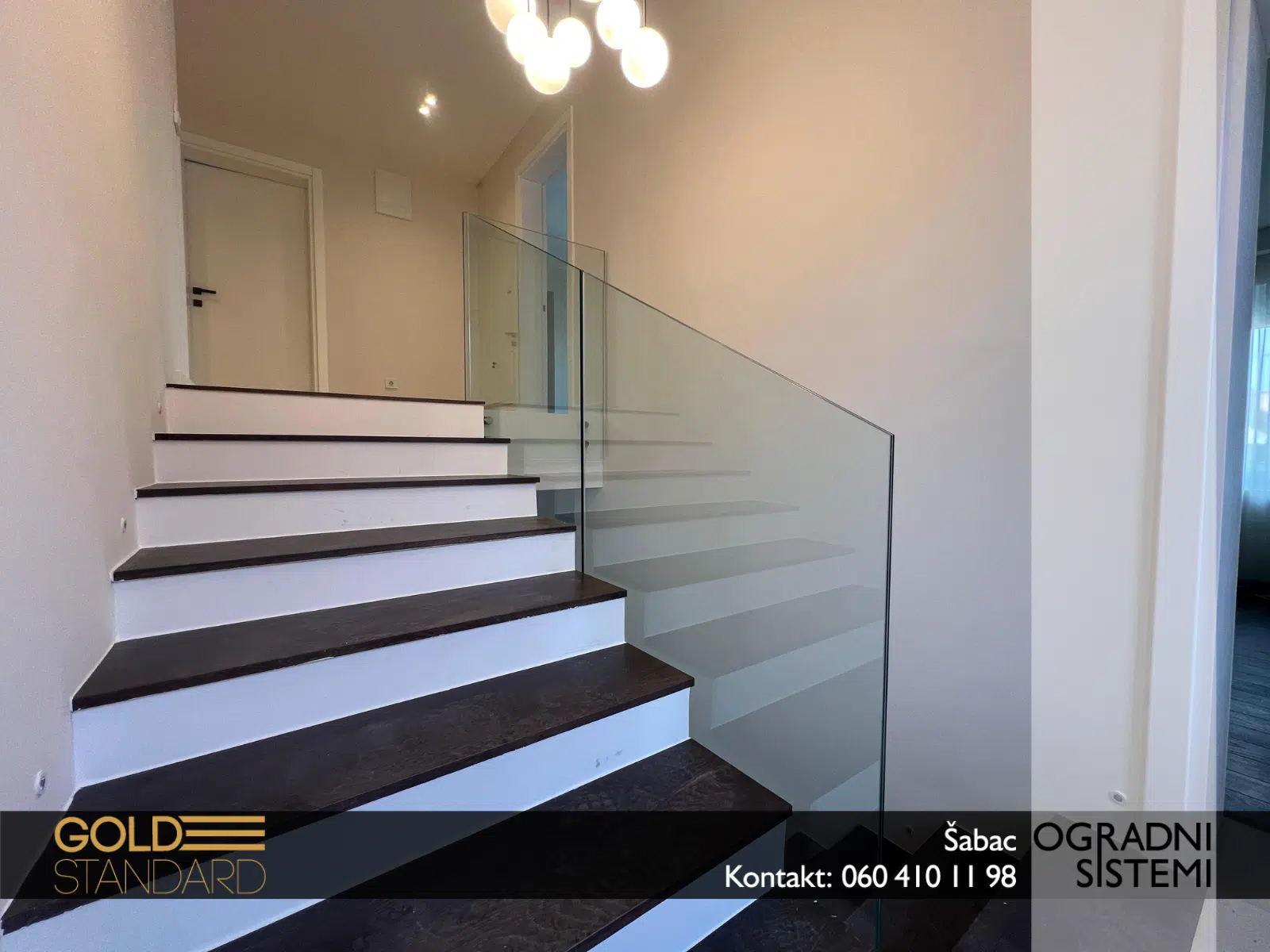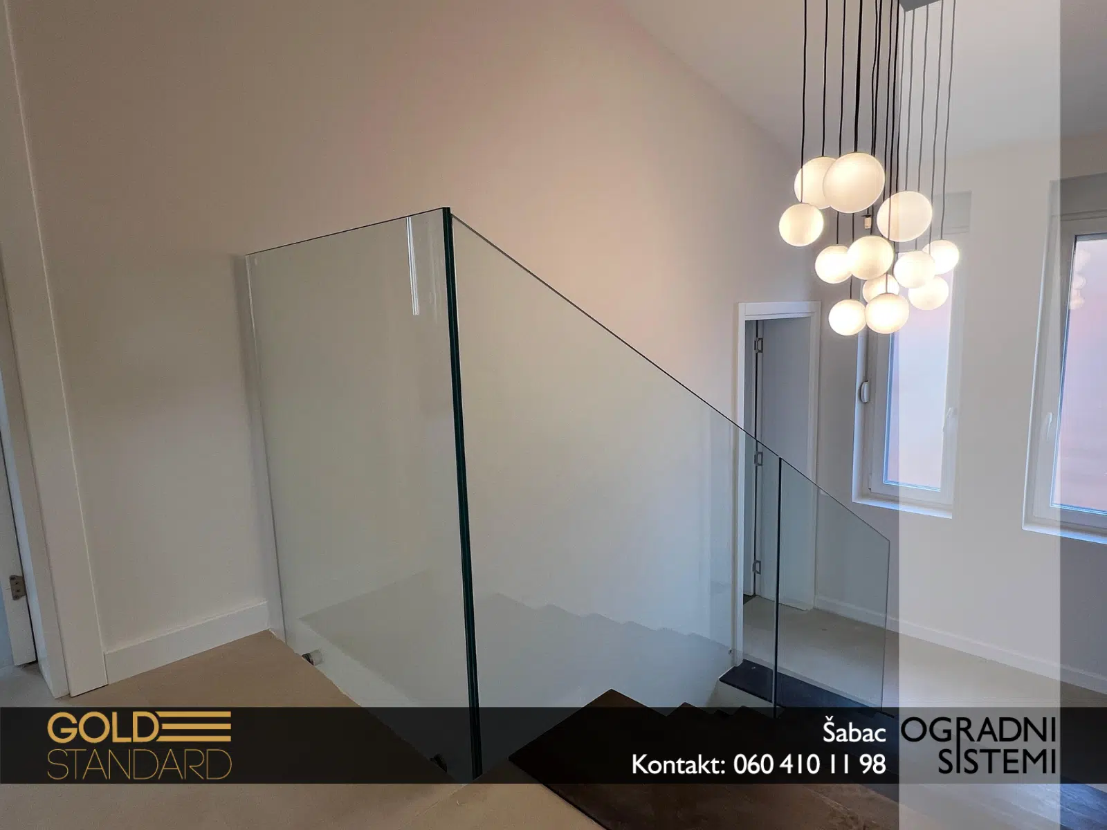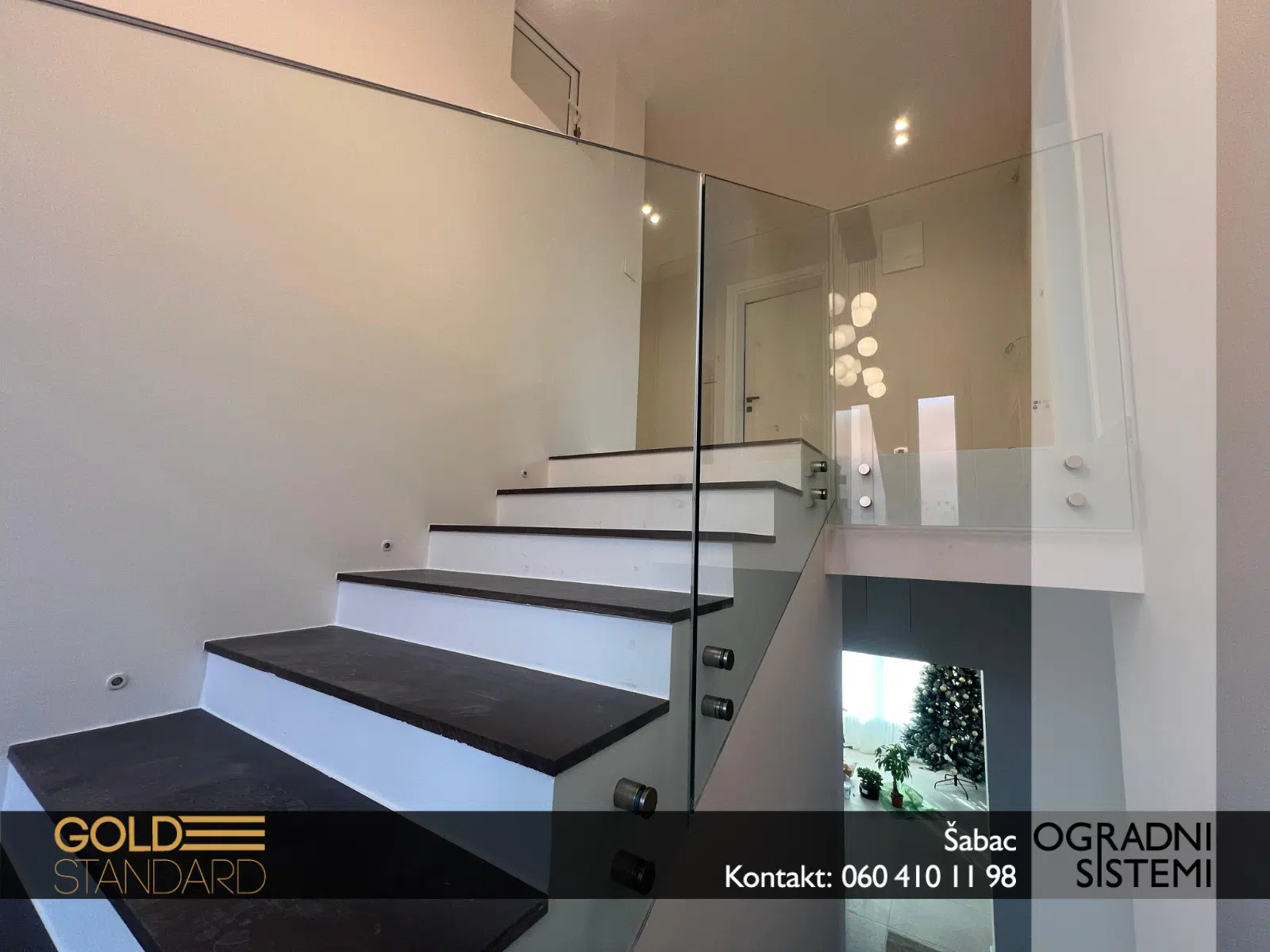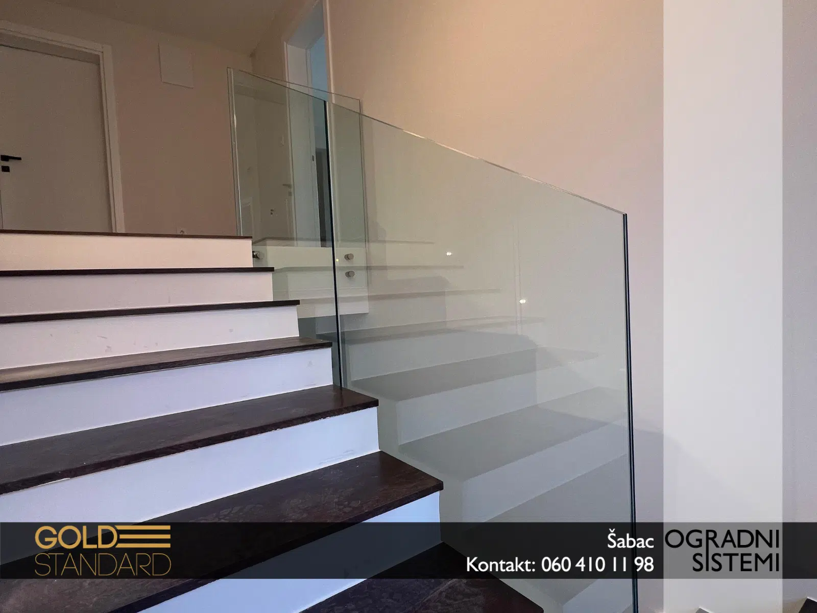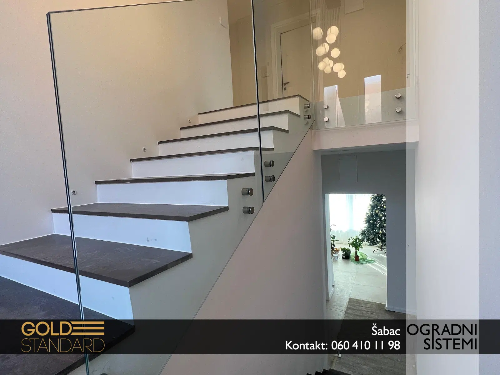 Izrada i montaža staklene ograde na stepenicama porodične kuće u Šapcu. Ugrađeno je kaljeno i laminirano staklo ( 8 + 8 + 3 ) sa blagim stepenom zatamnjenja (30%). Ogradu nose INOX bočni nosači.