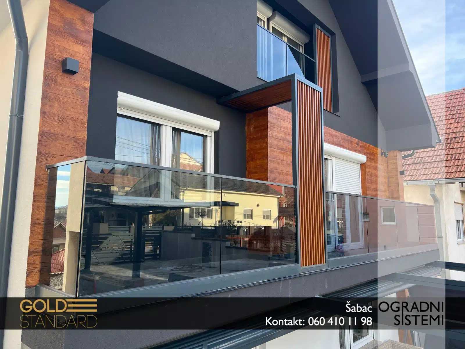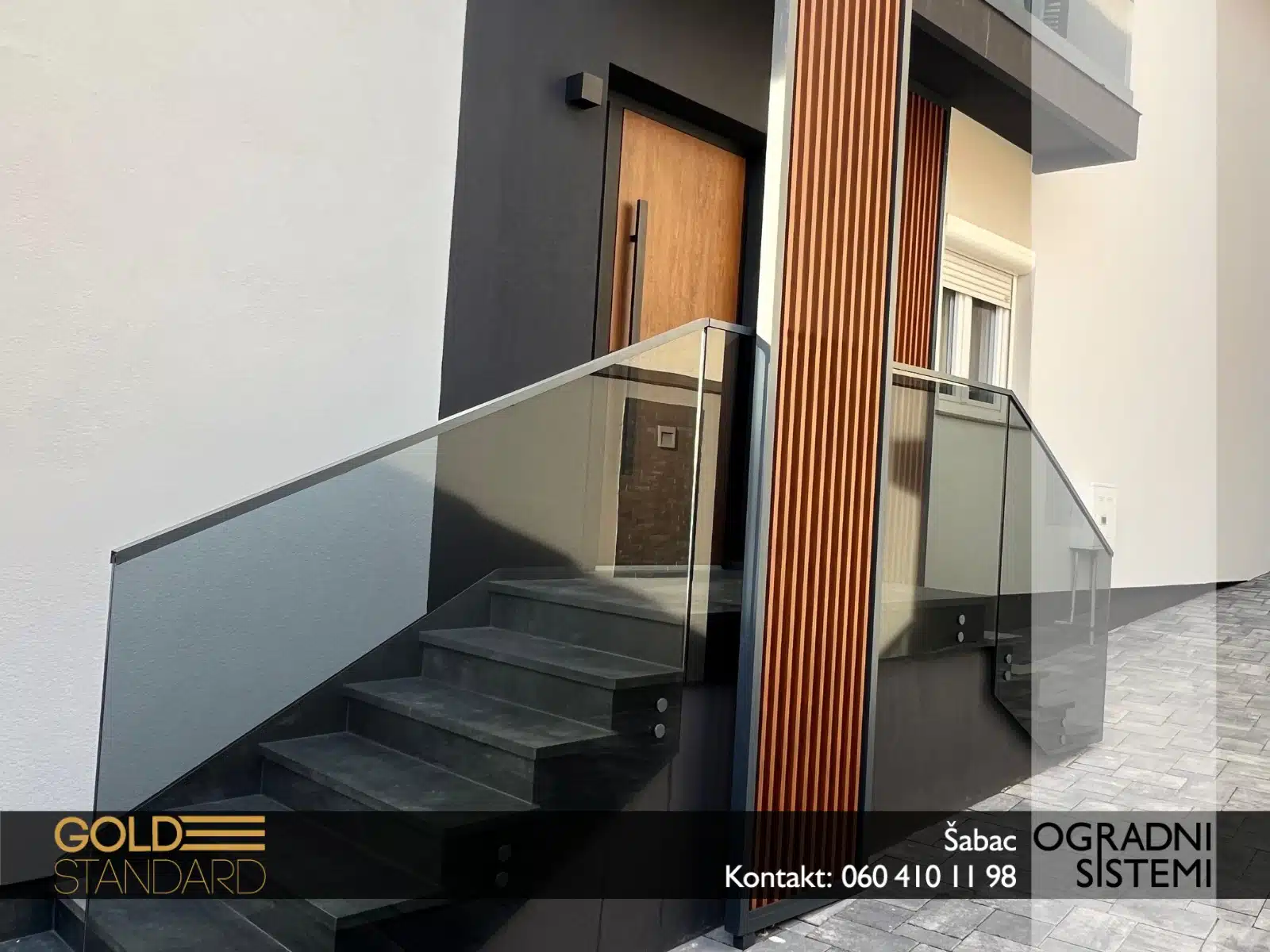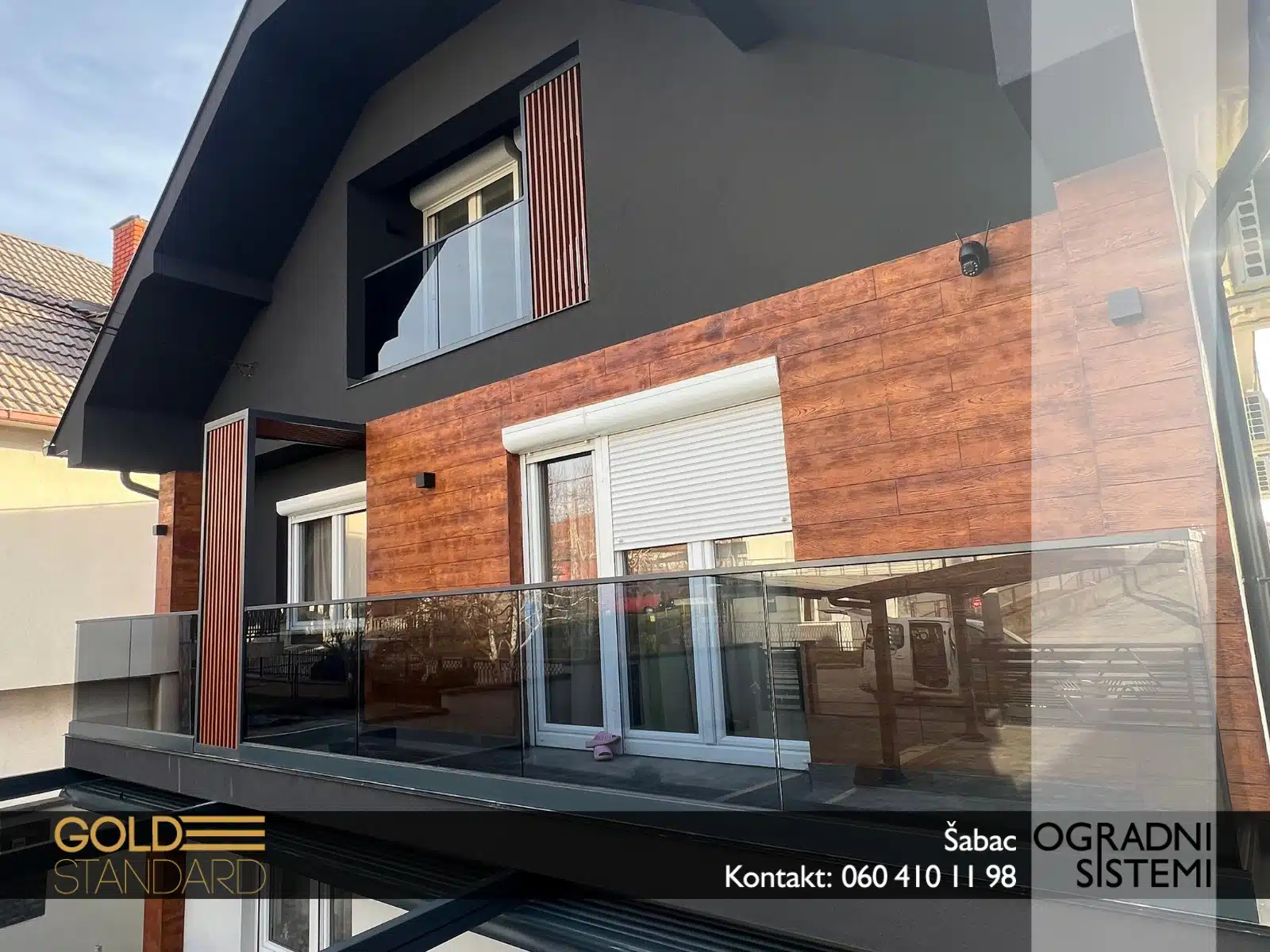 Izrada i montaža staklene ograde na ulazu i terasama porodične kuće u Kragujevcu. Ugrađeno je flot staklo 16mm + sivi parsol.
