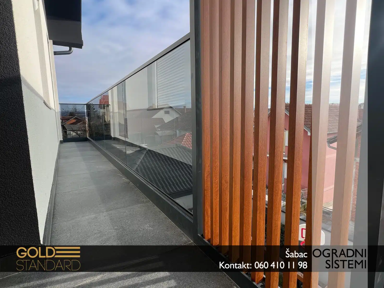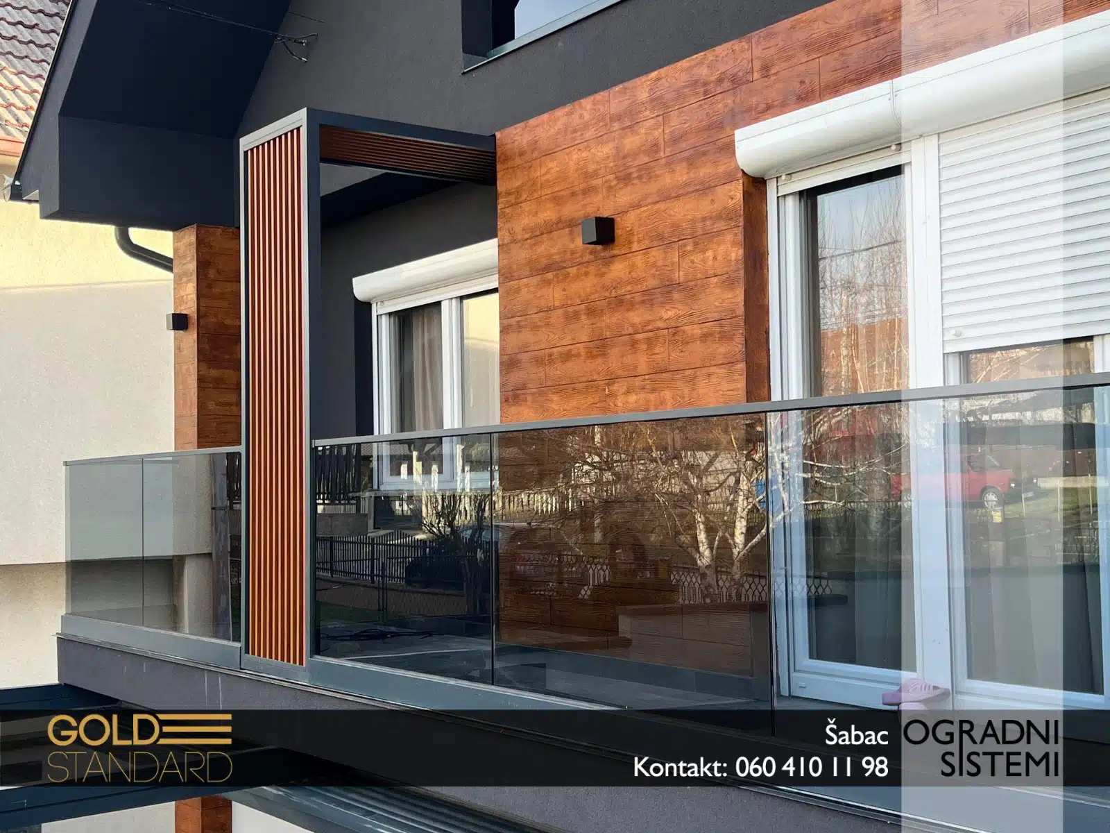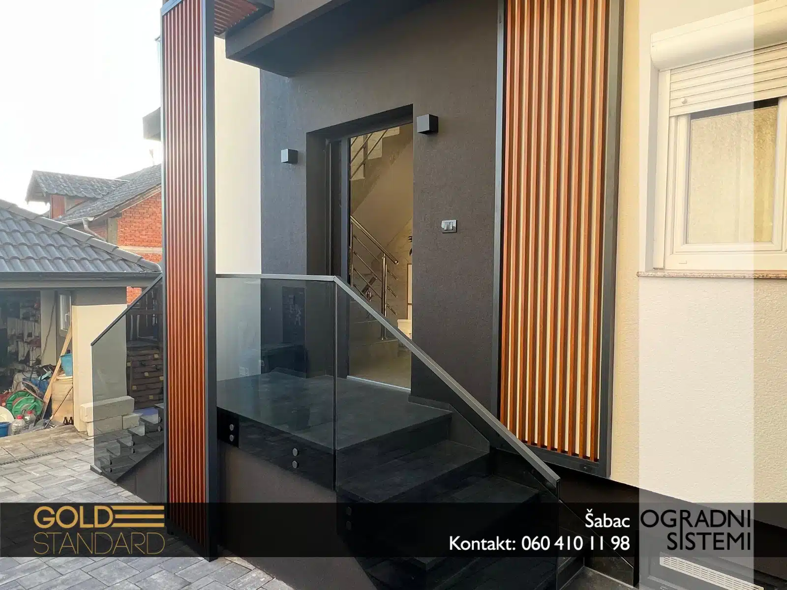 Izrada i montaža staklene ograde na ulazu i terasama porodične kuće u Kragujevcu. Ugrađeno je flot staklo 16mm + sivi parsol.