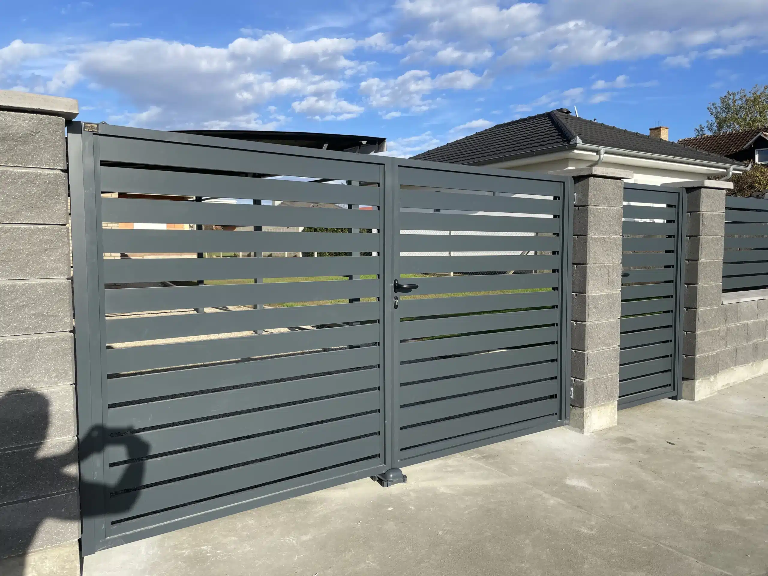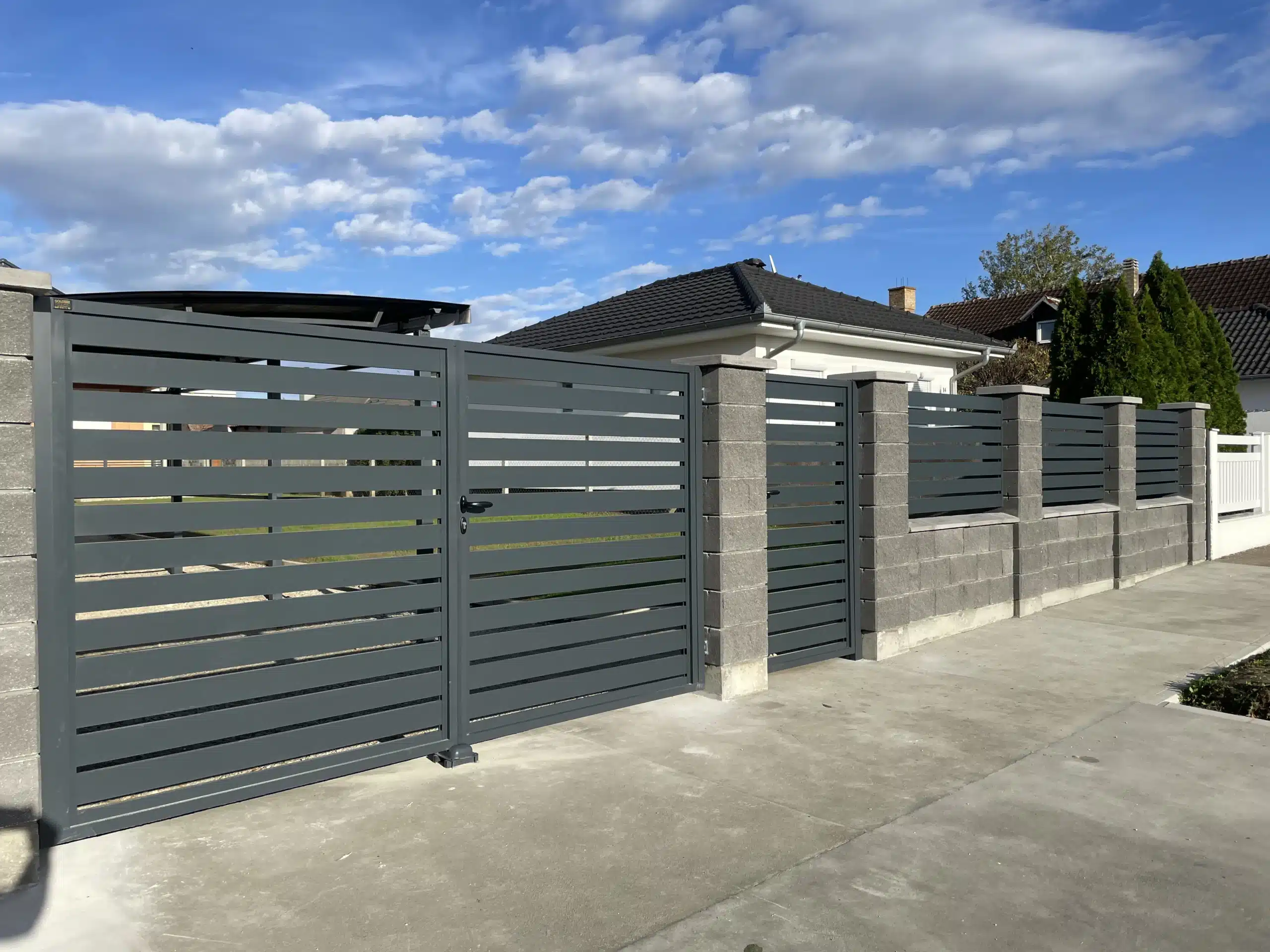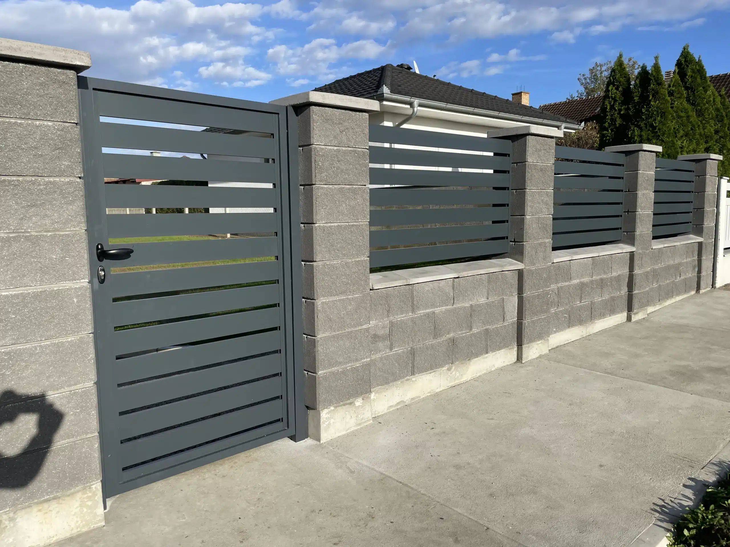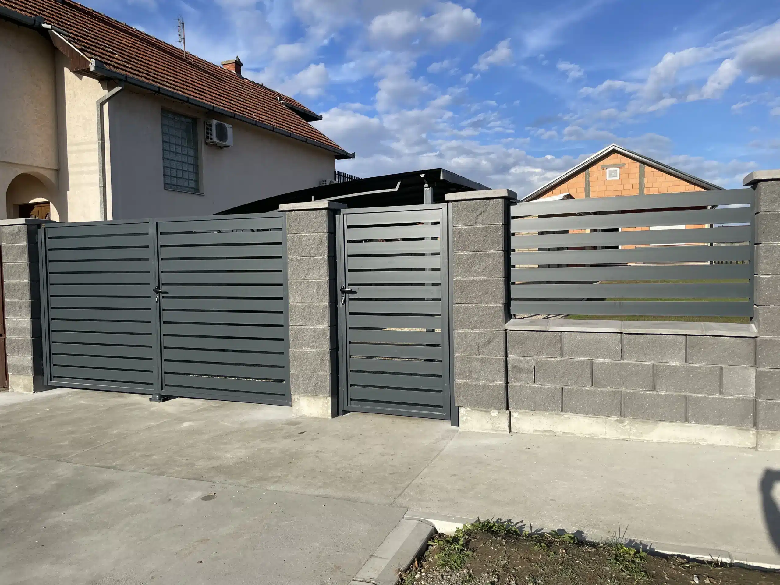 Za ovaj projekat odabrali smo antracit sivu boju koja se odlično slaže sa sivim dekorativnim blokovima korišćenim za zidanje ograde. Ovaj sofisticirani mat finiš pruža moderan, ali prirodan izgled, koji ne samo da doprinosi estetskoj vrednosti, već i obezbeđuje izuzetnu otpornost na spoljašnje uticaje. Aluminijum je materijal koji se odlikuje dugotrajnim kvalitetom i lakoćom održavanja, što ga čini savršenim izborom za vašu ogradu i kapiju.